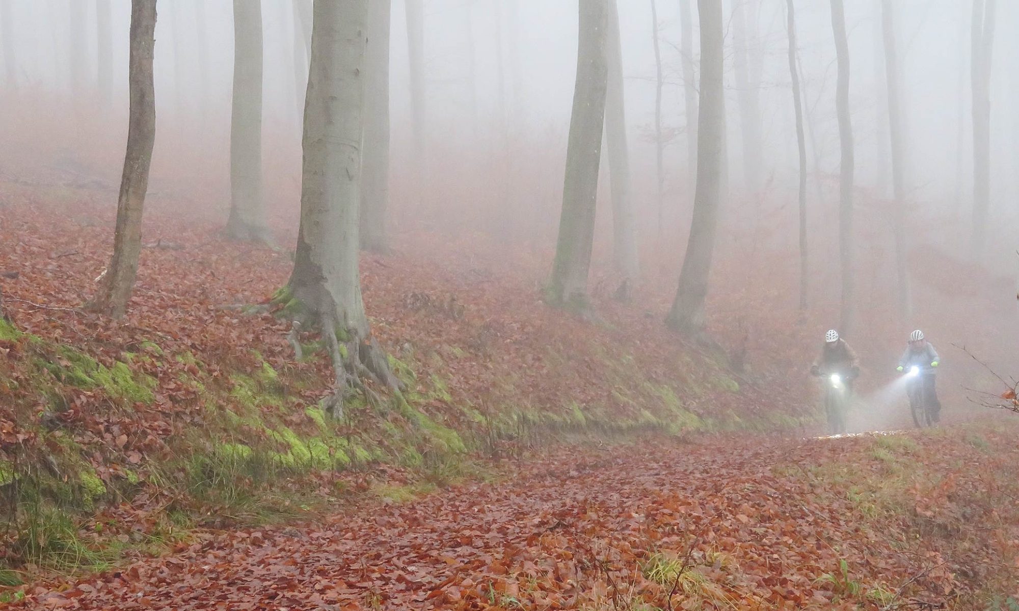 Versteckt unterm Laub ist der Boden nicht gefroren, sondern auf diesen Trails lehmig-feucht.