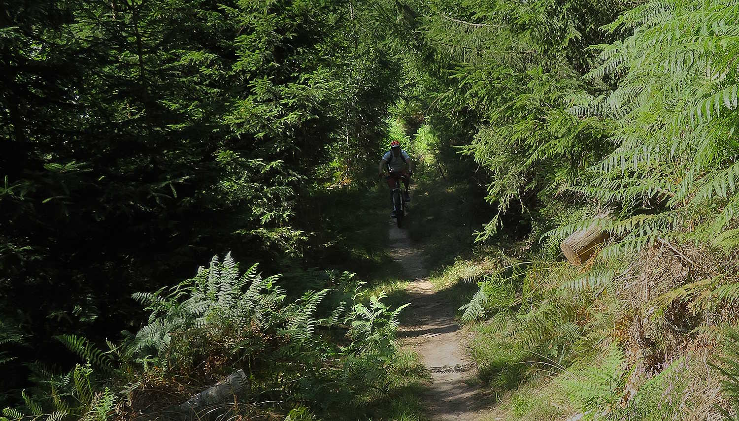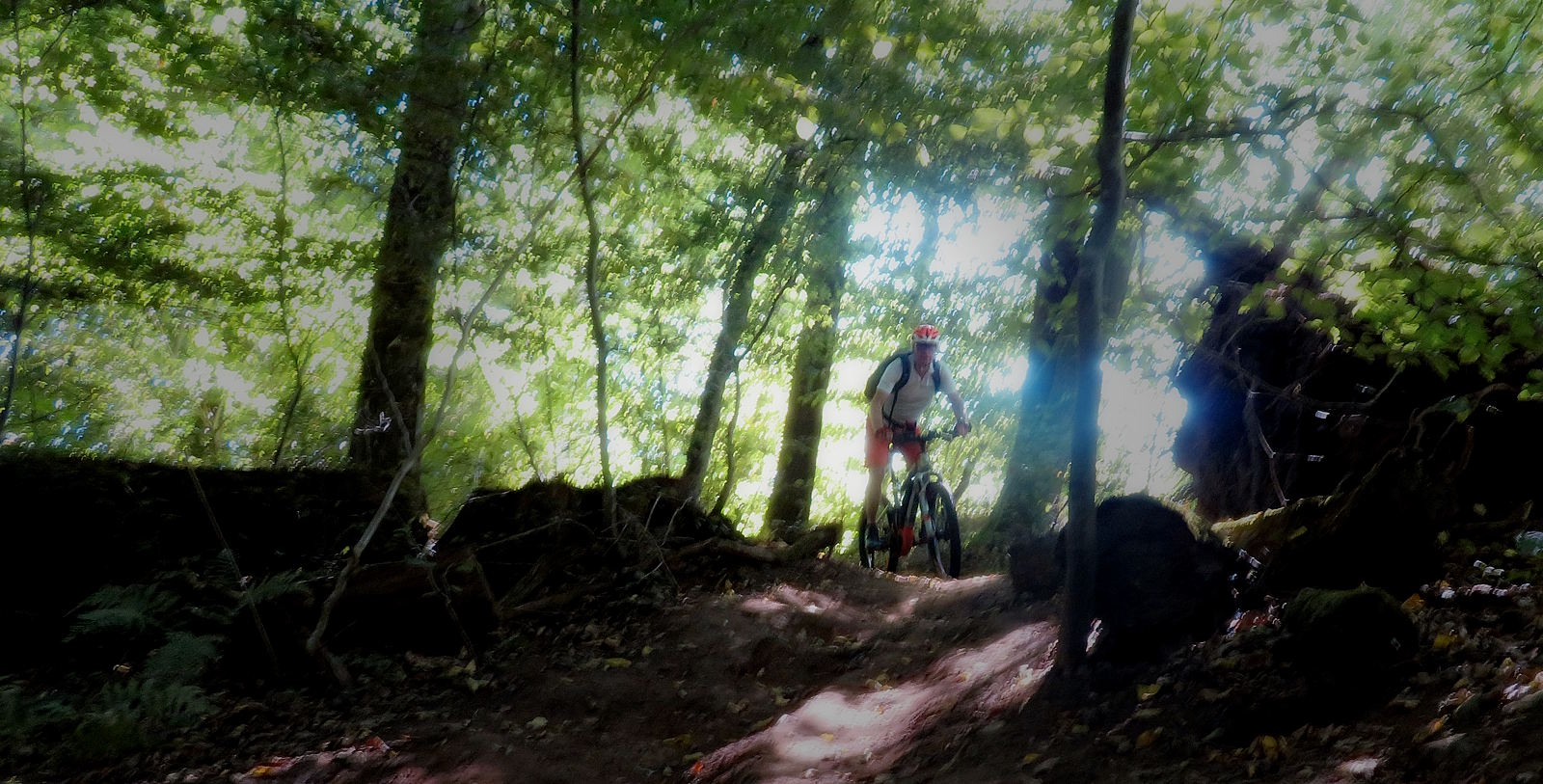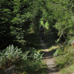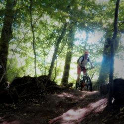 Und dies ist eine durchaus anspruchsvolle Angelegenheit; viele Wurzeln, viele enge Stellen, aber auch viele wunderbare Stellen. Trails, die mit Heidekraut gesäumt sind, sandige Teile oder einfach guter griffiger Waldboden. Wir fahren dann weiter zum Engelgrund. Anfahrt ebenfalls ein schöner Trail. Und dort sonnt sich dann für uns Fotografen eine dicke Schildkröte auf einem Ast in der Sonne.