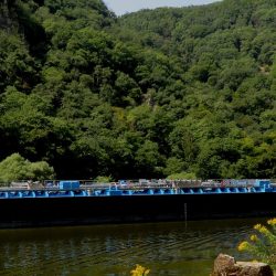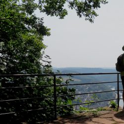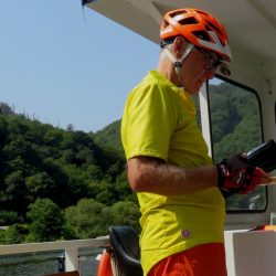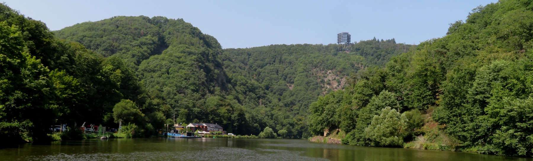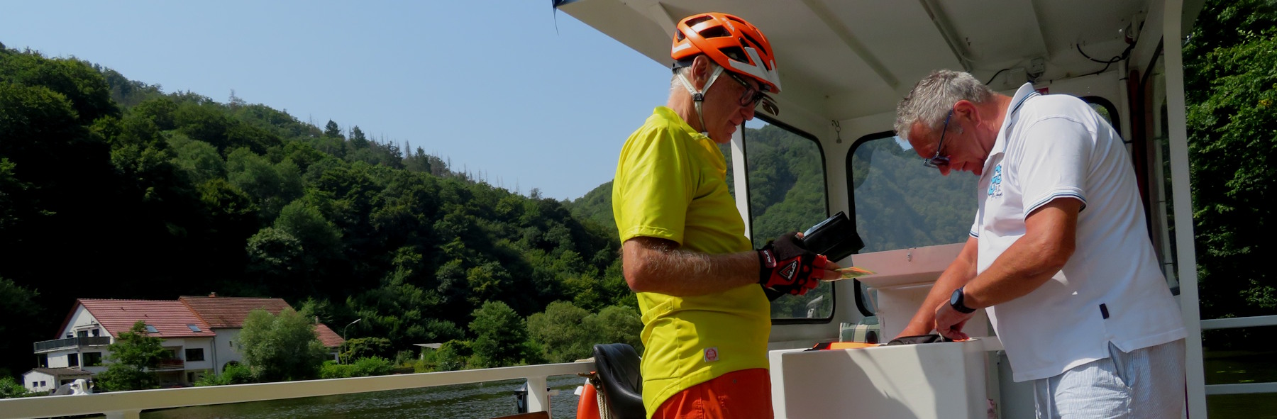 Bis zur Burg Montclair fährt es sich dann flüssig. Dort haben wir Eintritt bezahlt und die Ausstellung im Keller angeschaut und die Aussicht vom Turm aus genossen. Wieder unten packen wir unsere Brote aus. Ganz wenig Leute sind da – sehr angenehm. Es folgt der schöne Trail runter zur Saar – mit einem neuen Wegstück, das direkt zur Anlegestelle der Fähre führt. Die Glocke schlagen und schon legt die Fähre von der anderen Seite ab. Der Kapitän ist wie immer sehr freundlich. Wir sind schon ein paar Meter auf dem Wasser, da kommt noch ein Mann angelaufen. Der Kapitän fragt, ob es uns recht ist, wenn wir wieder anlegen und ihn noch mitnehmen… Auf der anderen Seite will dieser Mann uns als Dankeschön noch einen ausgeben, aber wir wollten lieber einen Kaffee in der Saarschleifen-Lodge trinken. Rast Nummer Drei.