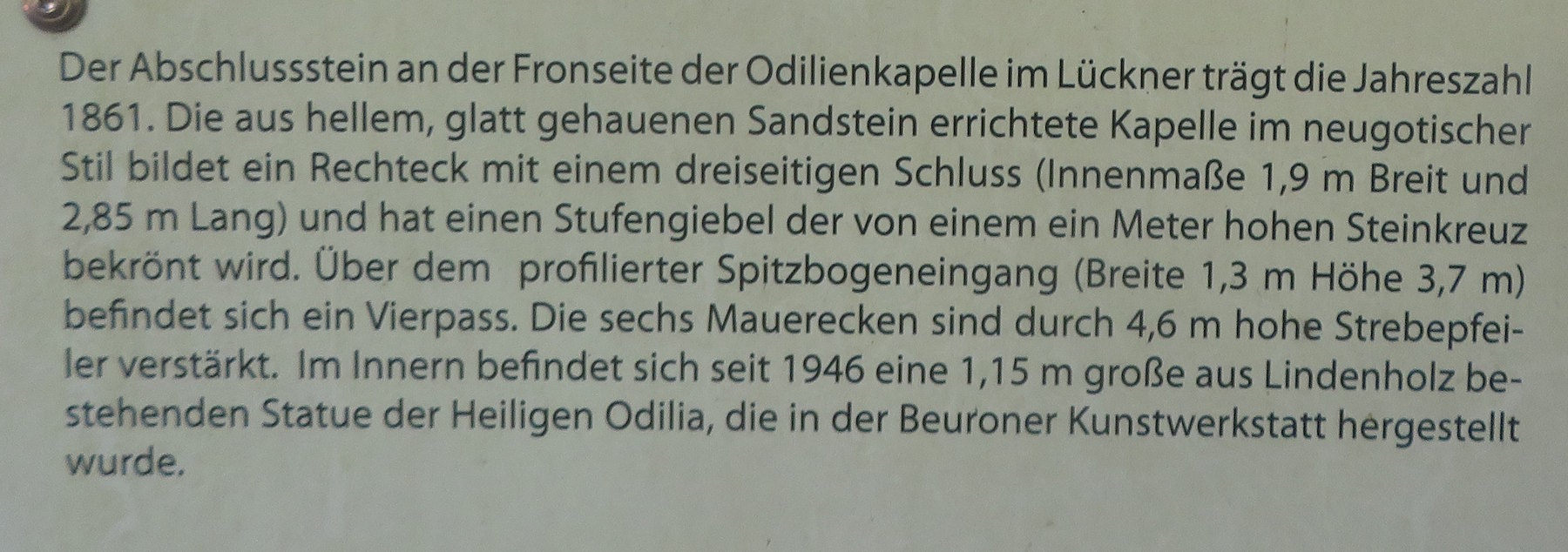 Die Kapelle aus dem Jahre 1861 liegt nicht nur geographisch im Zentrum des Lückner, sie ist auch der spirituelle Mittelpunkt als Heiligtum und Kraftort. Wer dort vorbei kommt, ist gut beraten, sich Zeit zu lassen, das Wasser zu trinken, sich über die geschichtlichen und sagenhaften Hintergründe zu informieren…