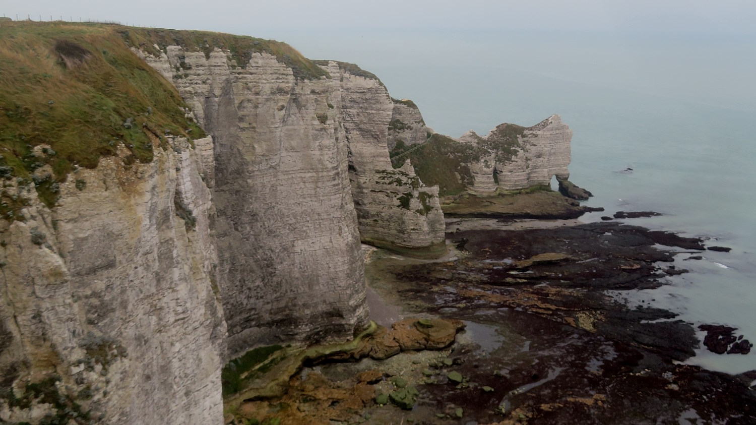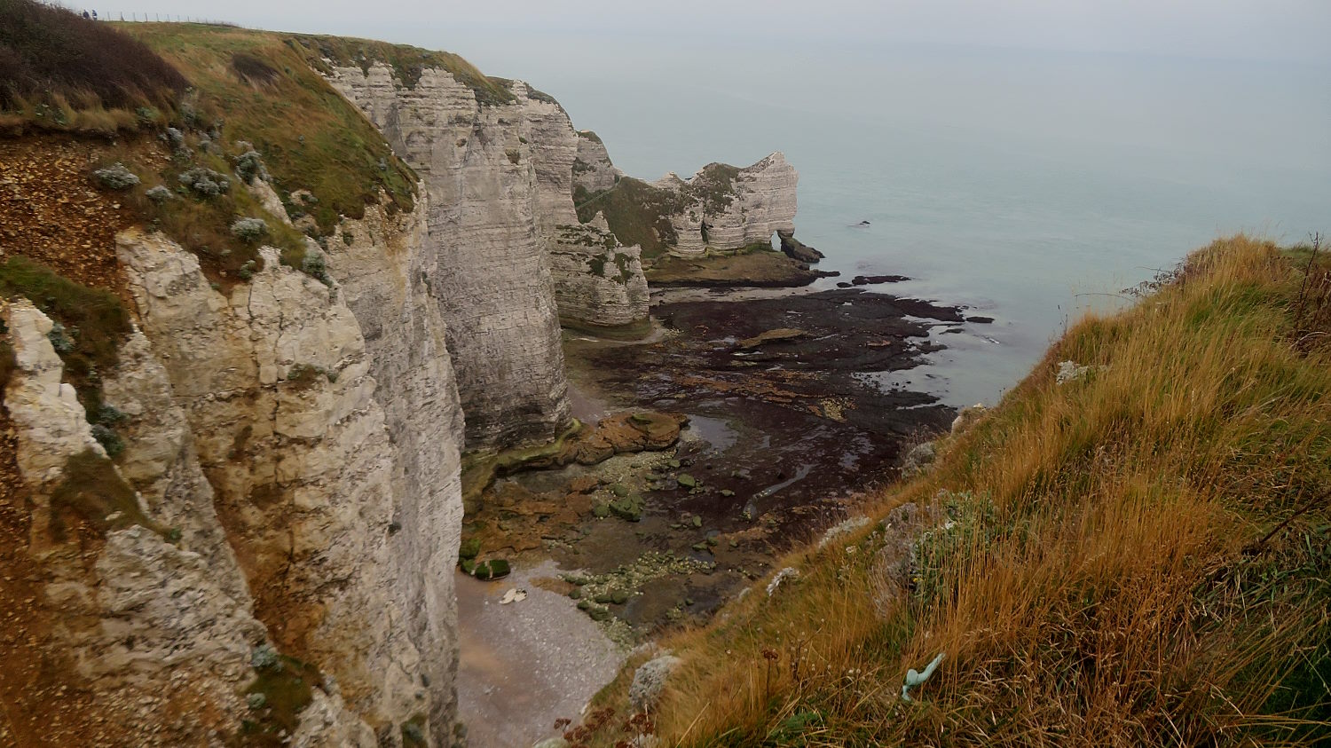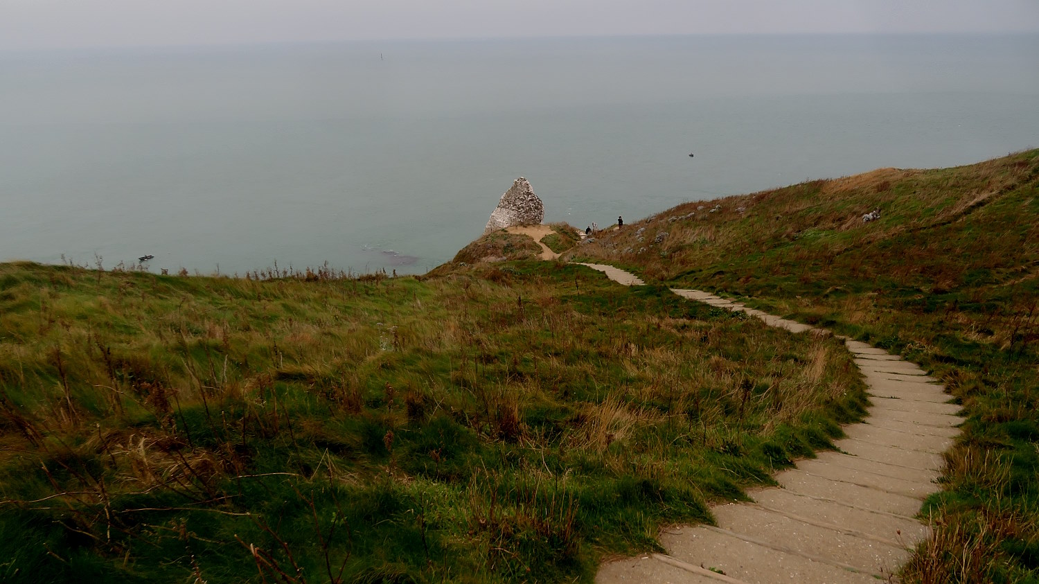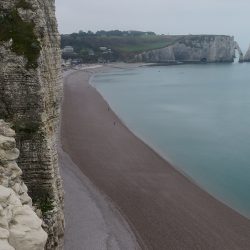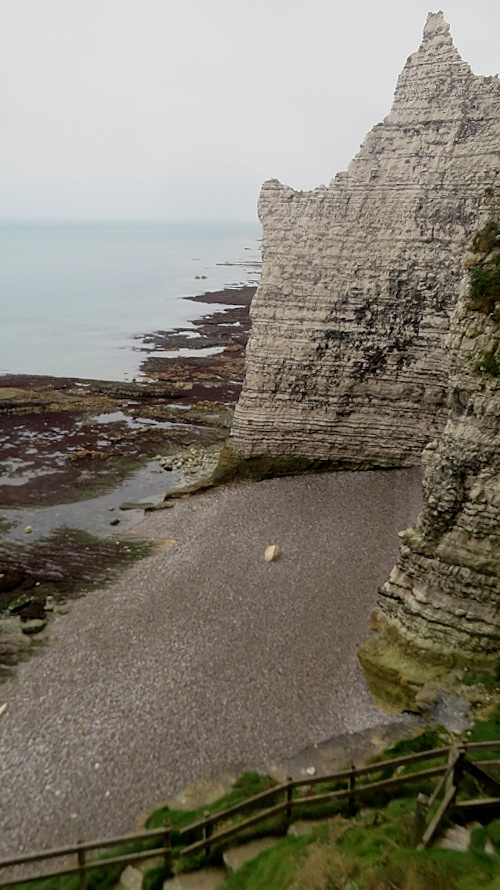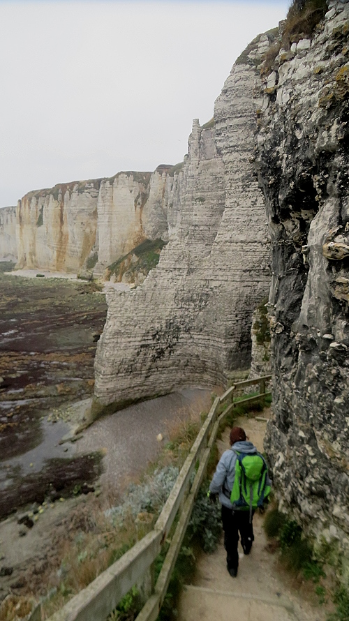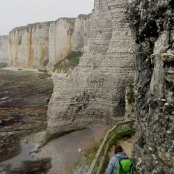 Dann finden wir vor Etretat einen spektakulären Pfad durch die Kreidefelsen hinunter zum Meer. Natürlich nur zu Fuß machbar – und das auch nicht für jeden…