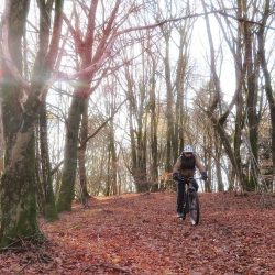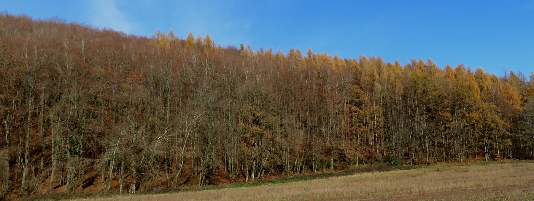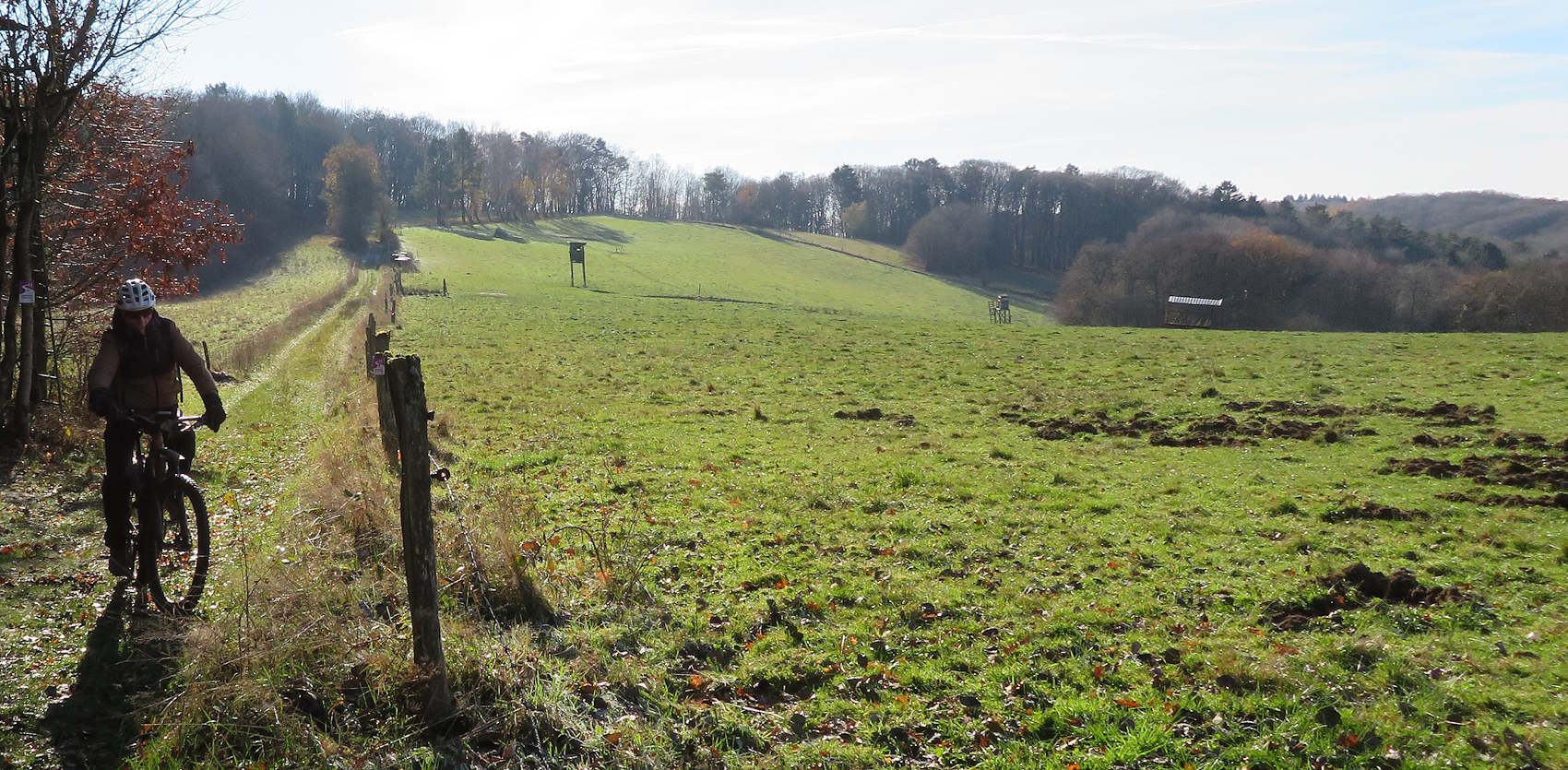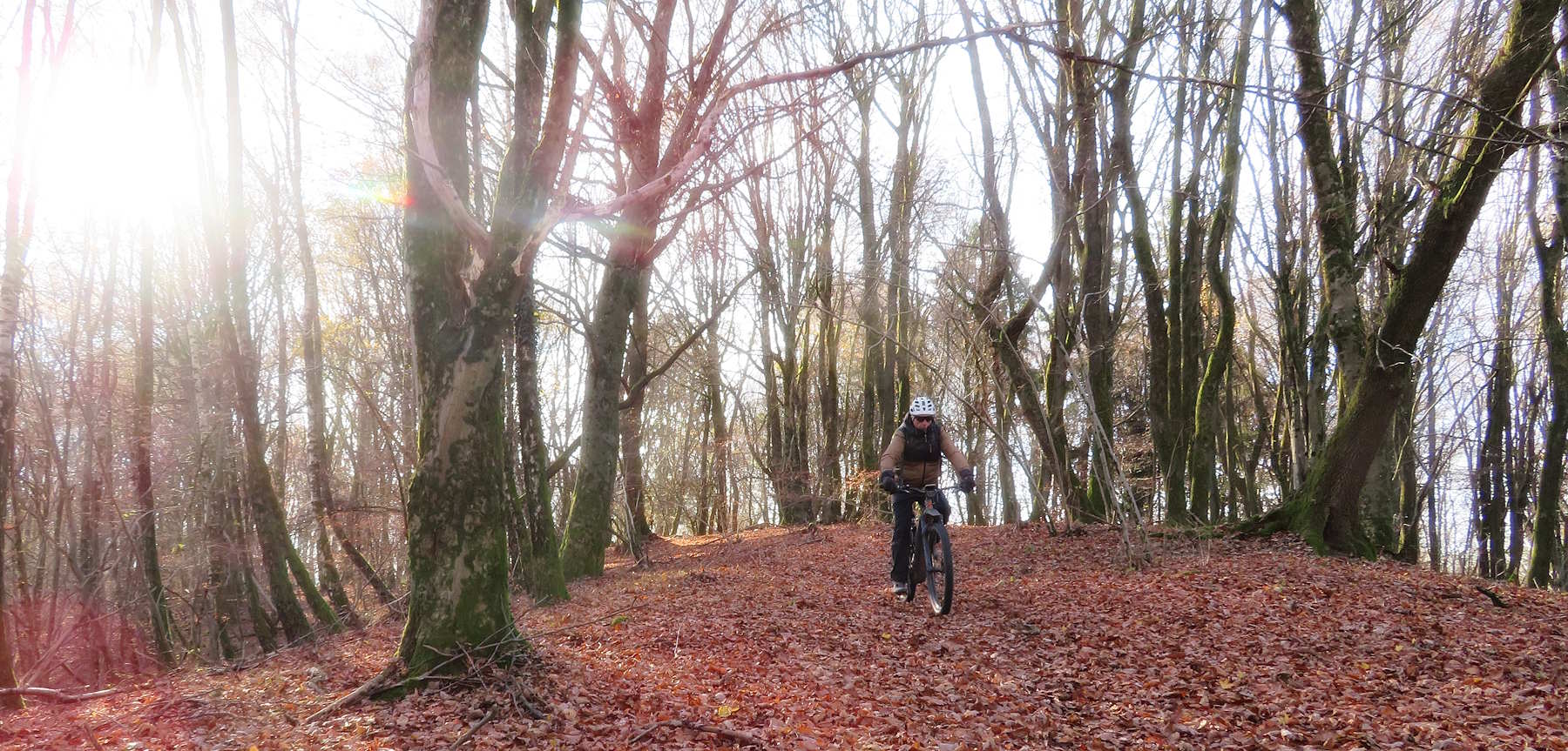 Der Trail über den Berg runter nach Wahlen ist kaum noch zu erkennen, so hoch liegt hier das Laub. Und das ist heute gefroren und im letzten steilen Teil des Weges sehr rutschig. Wanderer werden auf einem Schild gewarnt. Es gilt auch für Mountainbiker…