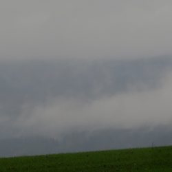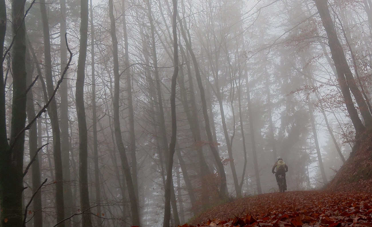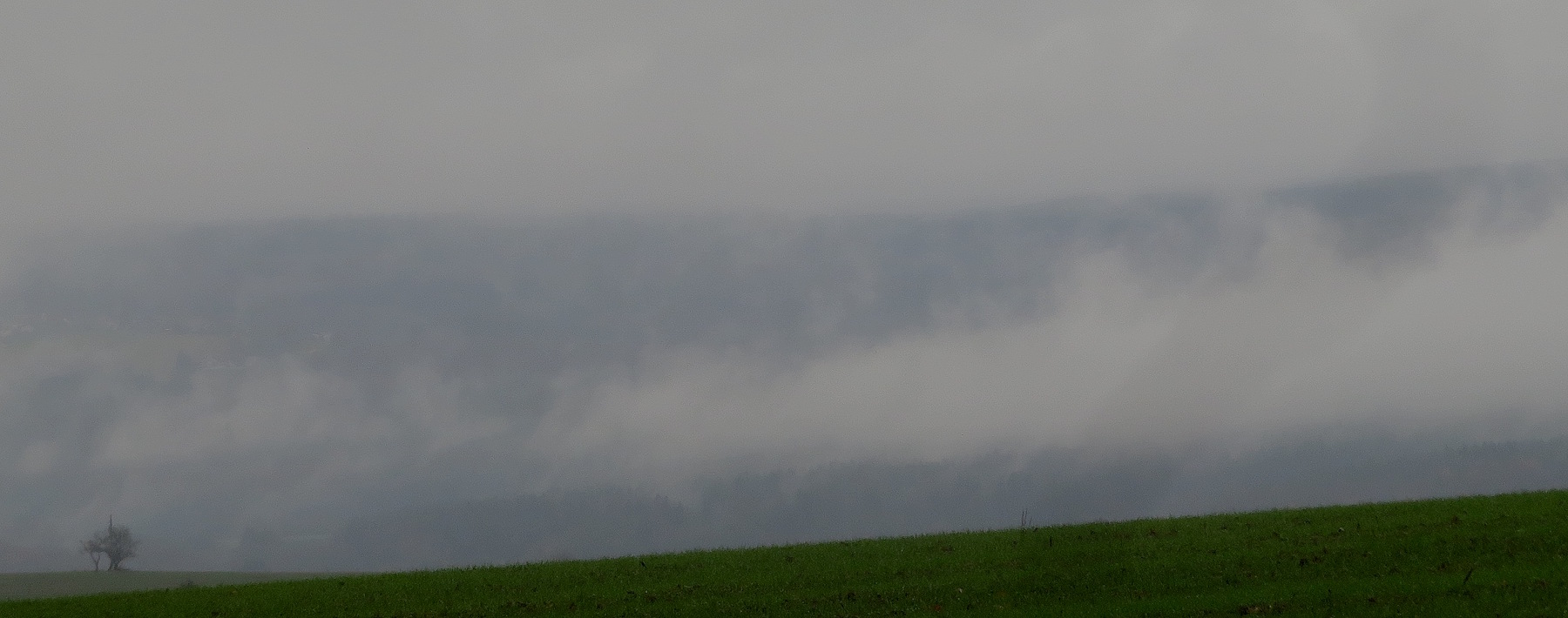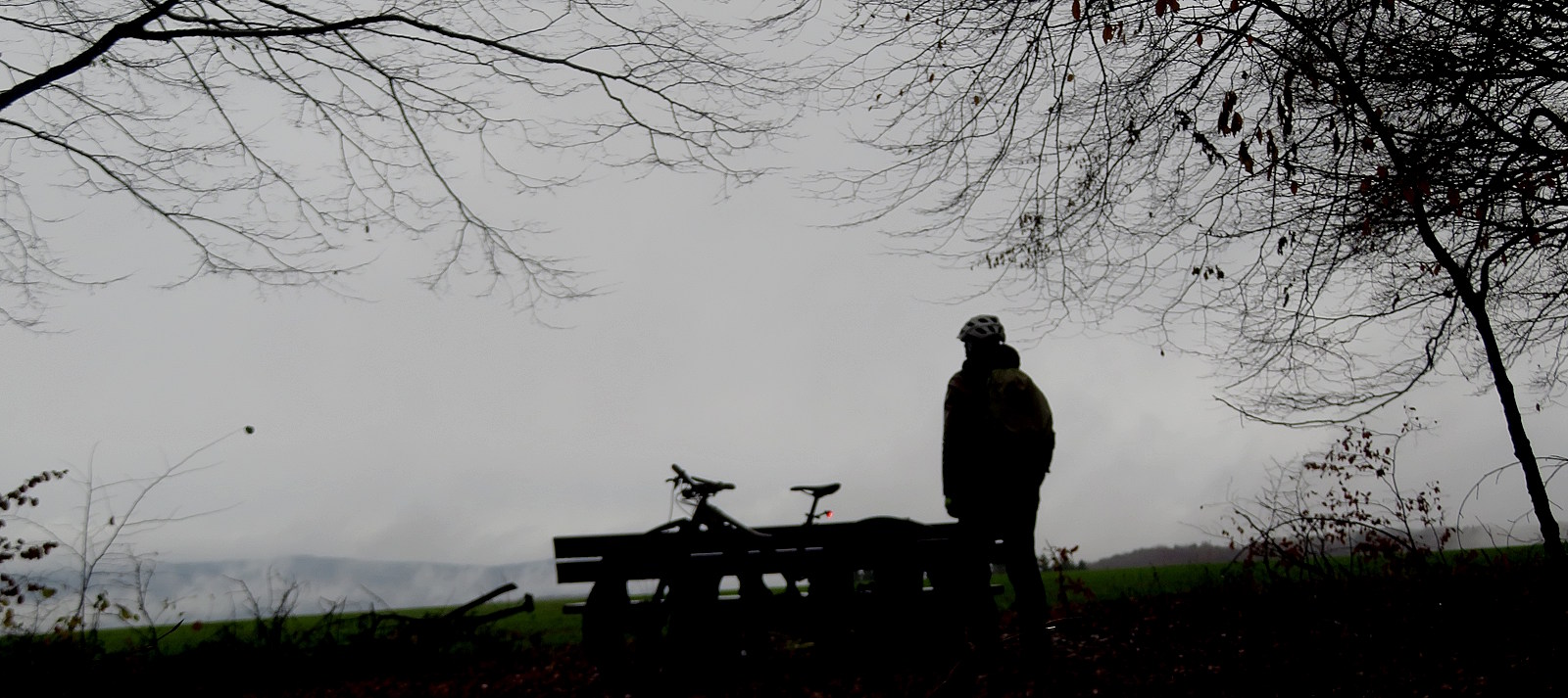 Auf dem Weg zur Wahlener Platte fahre ich schon durch tief hängende Wolken. Man spürt ihre Dichte und Feuchtigkeit. Auf dem quer laufenden Trail dann habe ich die Wolken unter mir. An der Bank streift der Blick hinüber zum Hochwald. Die Windräder auf dem Schimmelkopf sind nicht zu erkennen. Es war heute Morgen kein richtiger Regen, doch als ich zuhause ankomme, bin ich klatschnass…