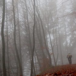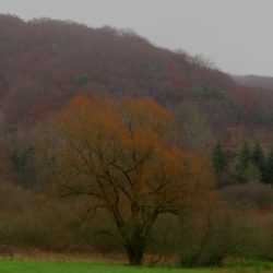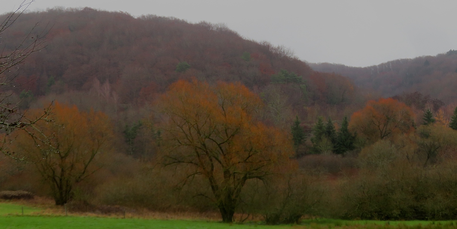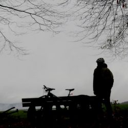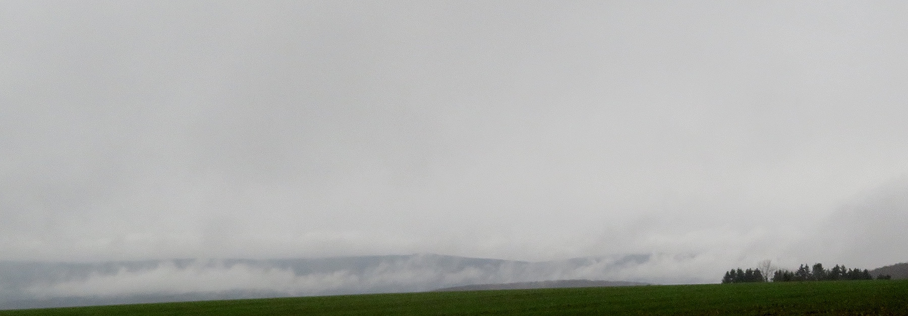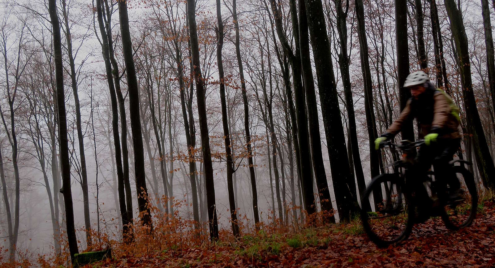 Auf dem Weg zur Wahlener Platte fahre ich schon durch tief hängende Wolken. Man spürt ihre Dichte und Feuchtigkeit. Auf dem quer laufenden Trail dann habe ich die Wolken unter mir. An der Bank streift der Blick hinüber zum Hochwald. Die Windräder auf dem Schimmelkopf sind nicht zu erkennen. Es war heute Morgen kein richtiger Regen, doch als ich zuhause ankomme, bin ich klatschnass…