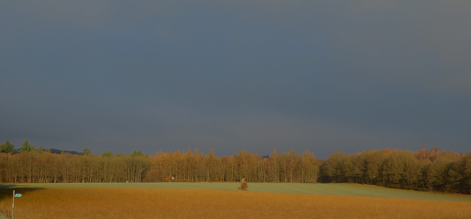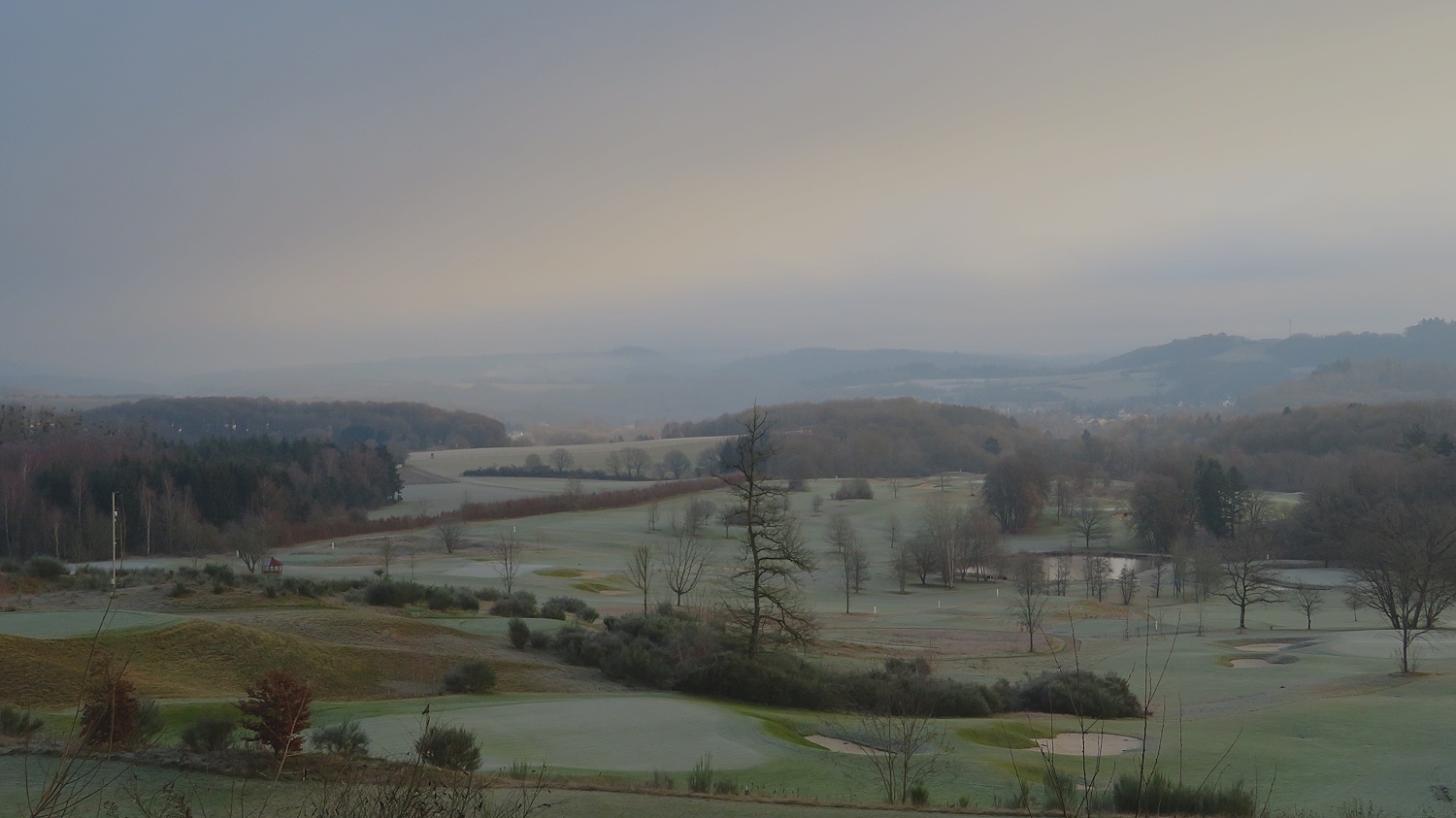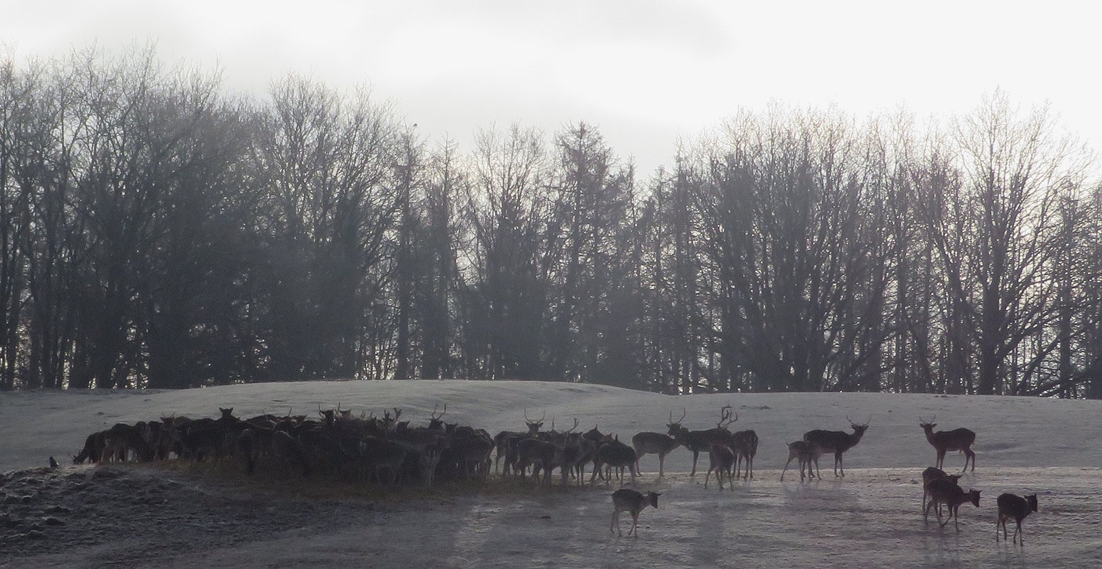 Beim Nunkircher Wildgehege halte ich mich etwas länger auf und schaue den Tieren zu. Ein großer Haufen hat sich eng aneinander gedrängt – wohl um sich gegenseitig zu wärmen. Ein Tier ließ sich sogar ein wenig streicheln. Auch die Landschaft am Golfplatz war in ein besonderes Licht getaucht.