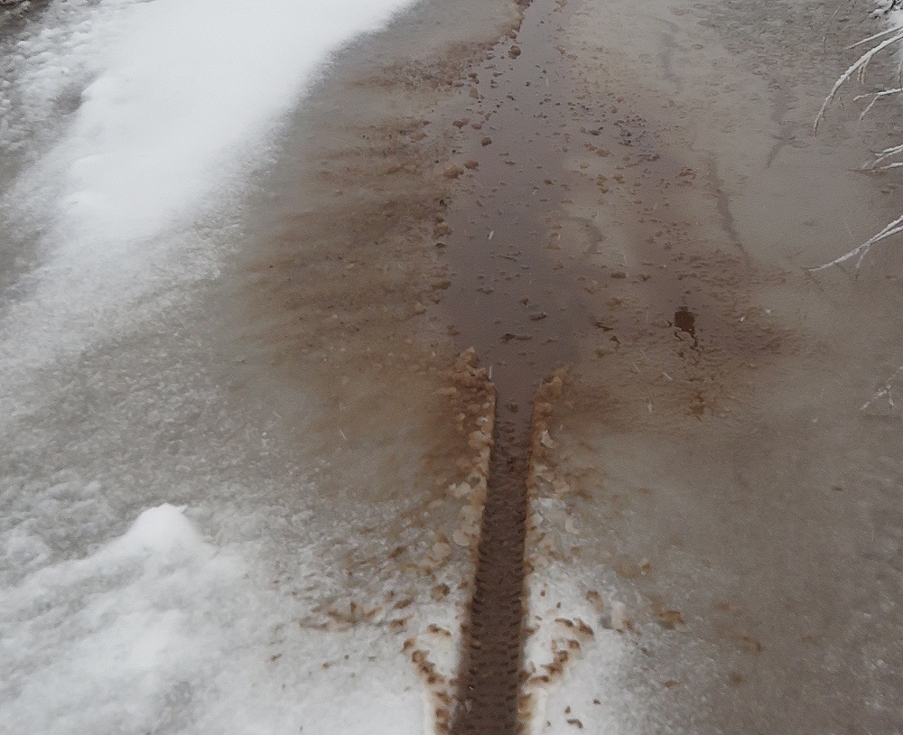 Aus weichem Schnee ist inzwischen nasser, flüssiger Schnee geworden, Schneematsch. Sowohl zum Gehen, Laufen oder Radfahren sehr schlecht geeignet…