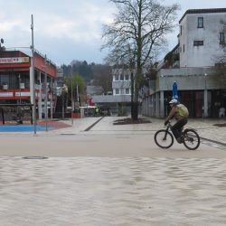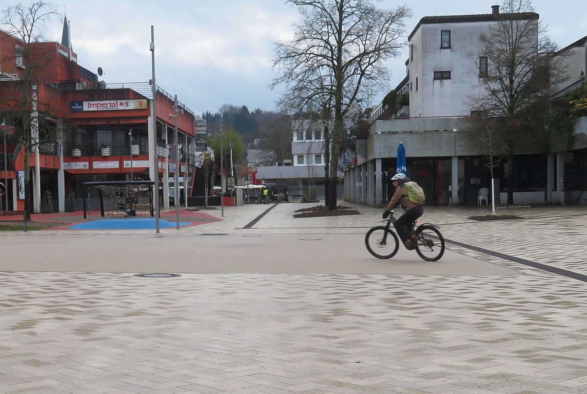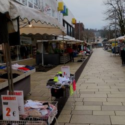 Zum ersten Mal sehe das neu angelegte Lebacher Stadtzentrum. Es sieht aus wie frisch gefliest und feucht sauber gewischt. Von Attraktivität oder Gemütlichkeit weit entfernt. Ein wenig Leben erhält die Fußgängerzone durch die wenigen Marktstände, die jedoch kaum Besucher aufweisen…
