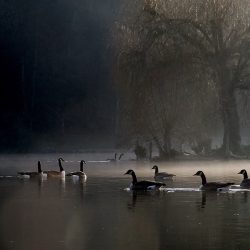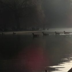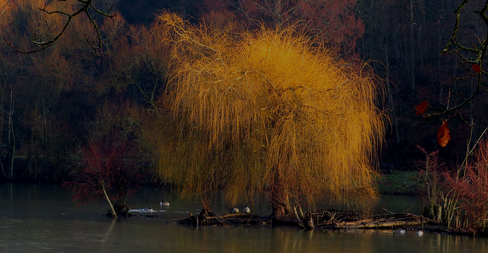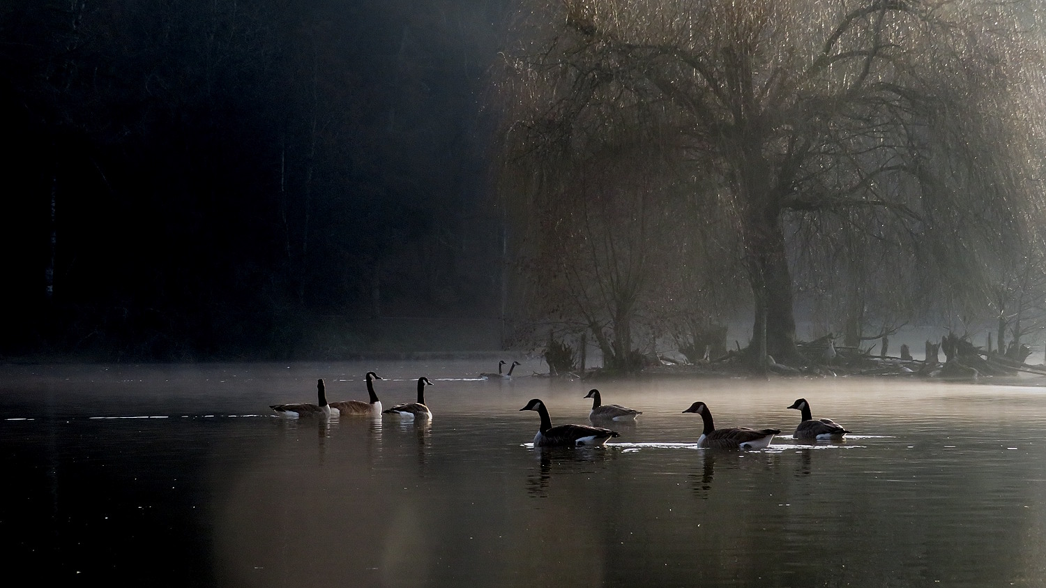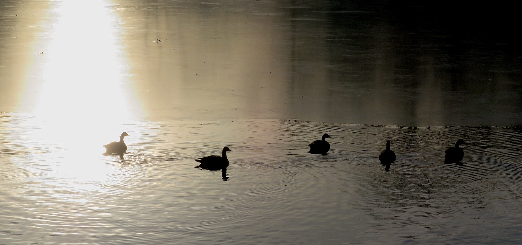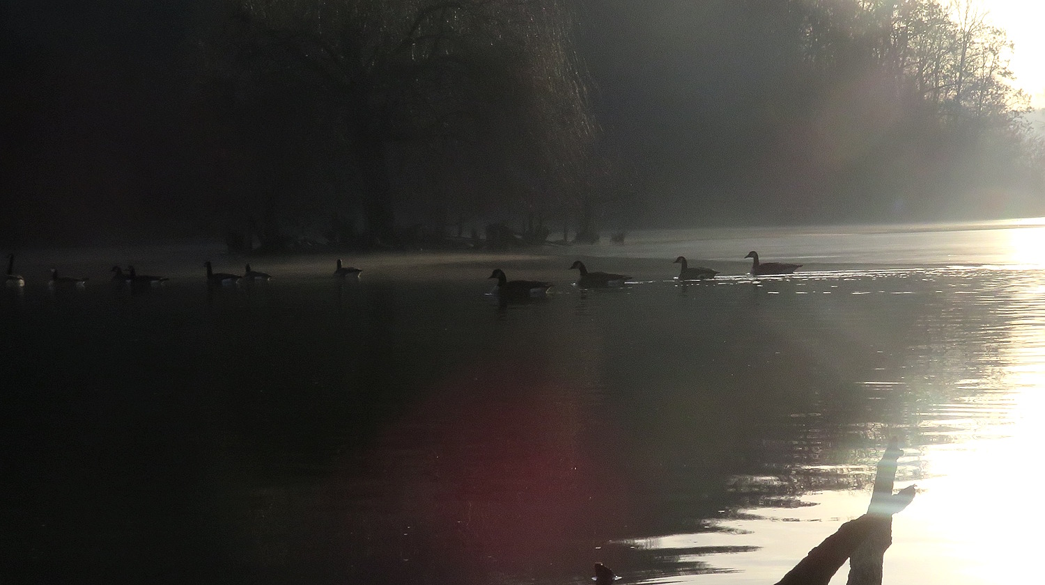 Meine Runde führt mich zuerst nach Münchweiler und von dort zum Weiher bei Überlosheim. Hier begrüßen eine Menge Gänse lautstark den sonnigen Morgen…