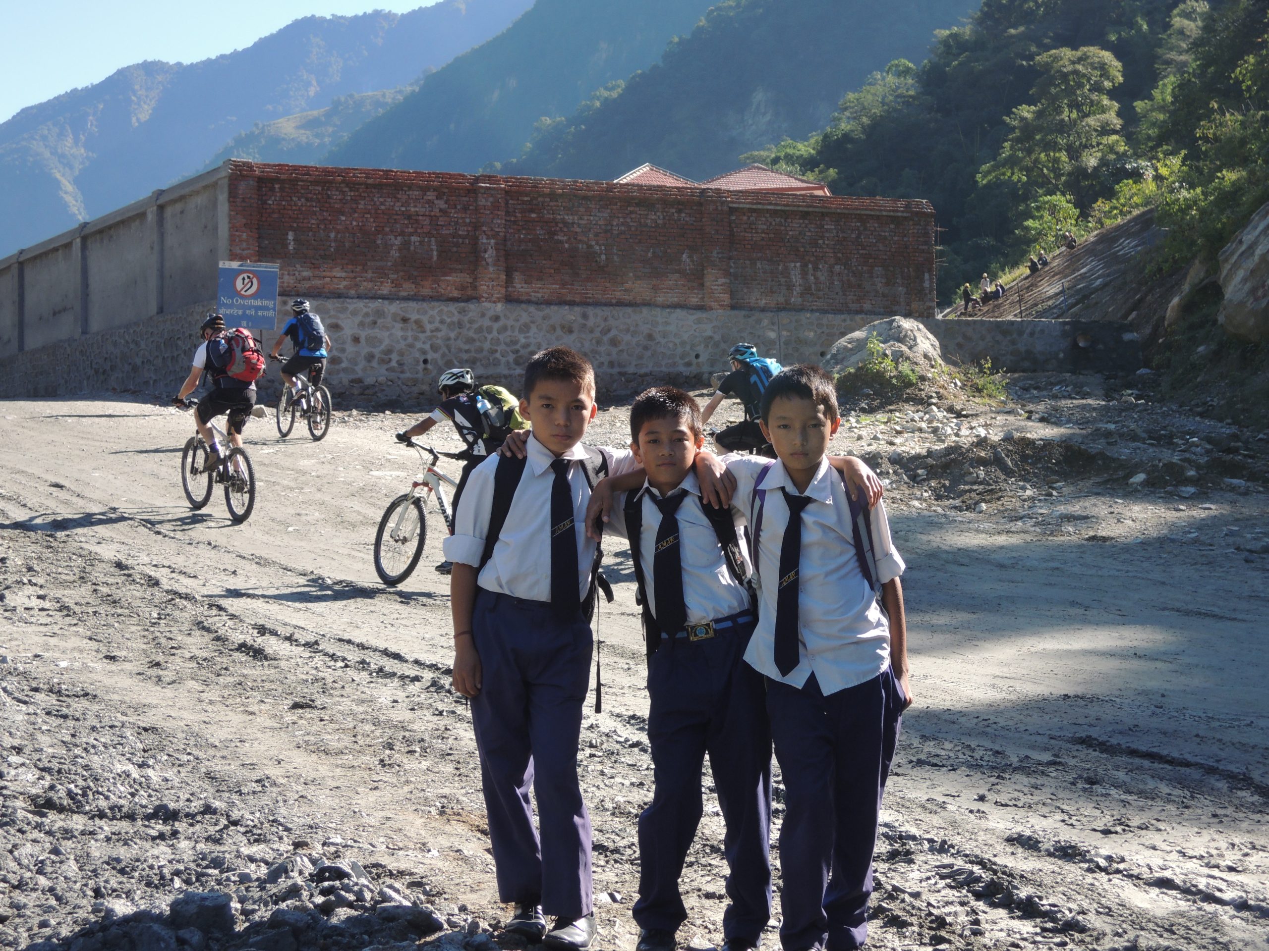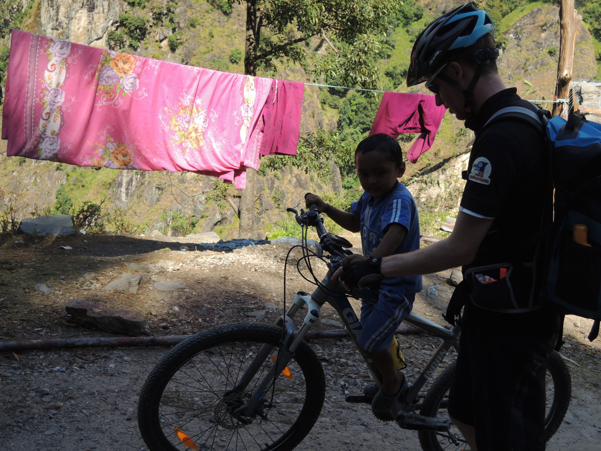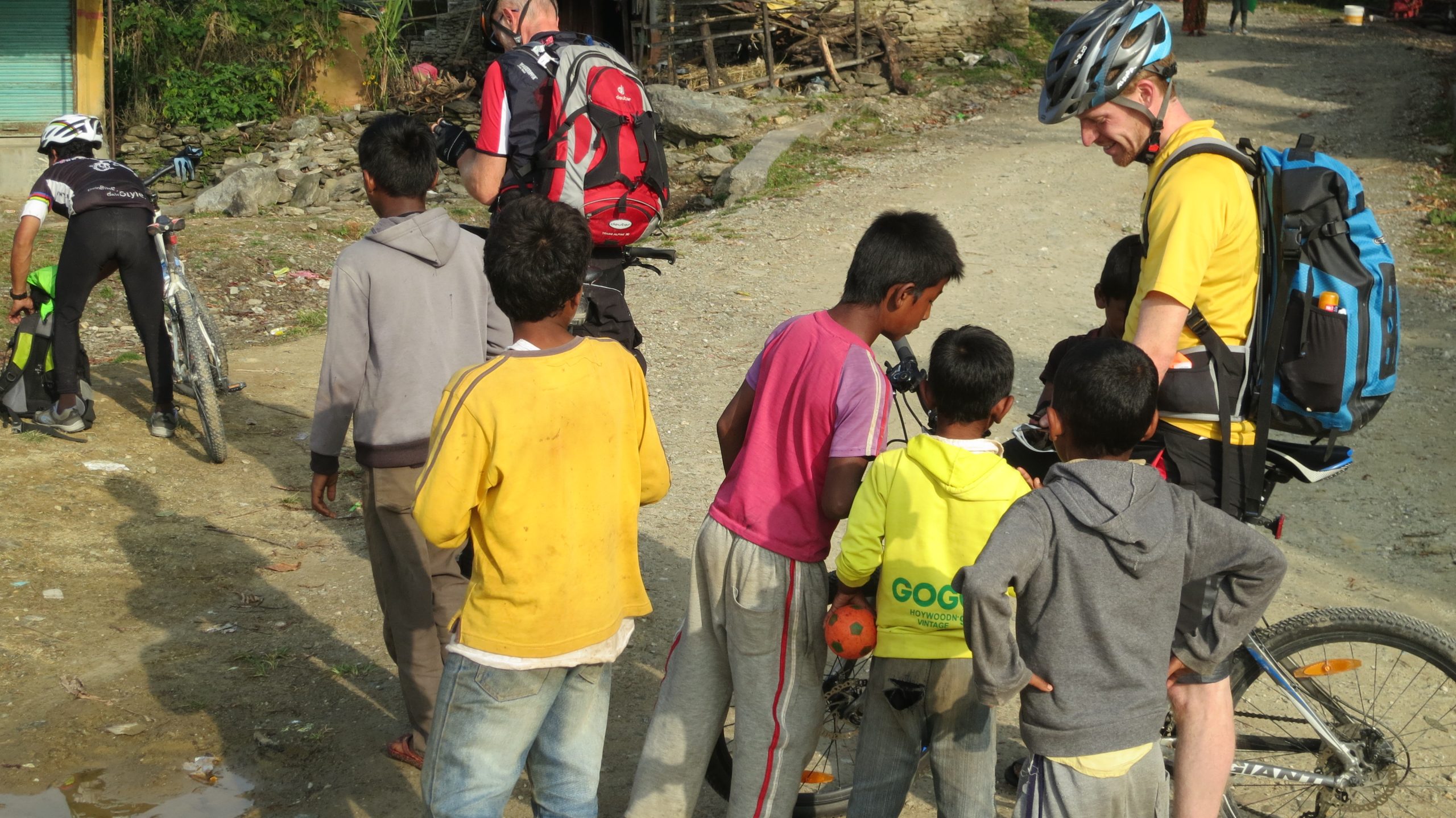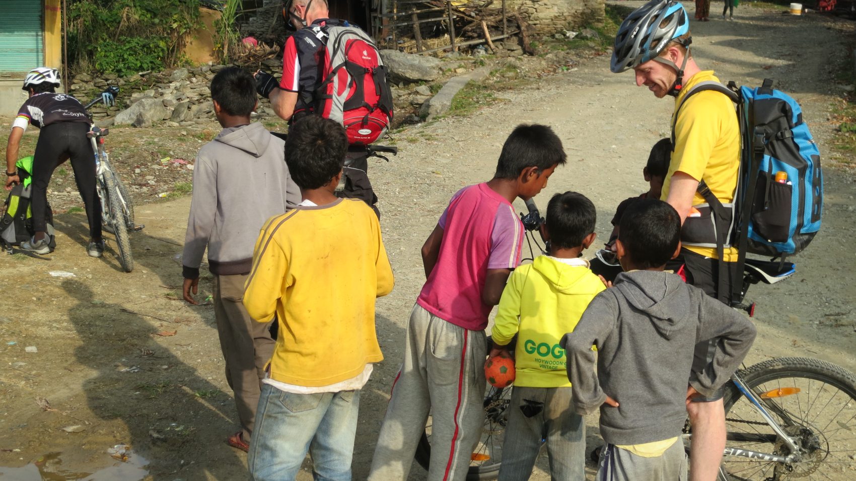 In der Nähe von Pokhara halten wir in einem Dorf kurz an – und schon sind eine Menge Jungs bei uns, die sich für unsere Räder und die Technik (z.B. Navigationsgeräte) interessieren. Manchmal lassen wir sie auch mal eine Runde auf unseren Rädern fahren …