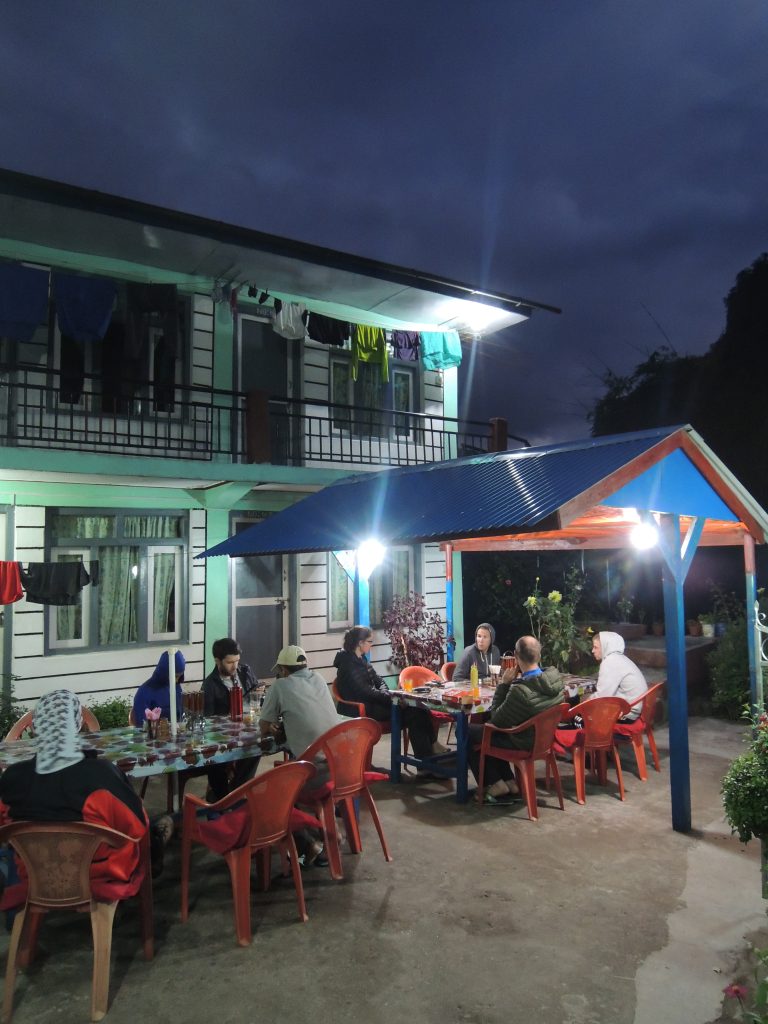 Manchmal sitzen wir auch abends in einer Lodge mit anderen Reisenden zusammen und tauschen uns aus. So erfahren wir auch auf unserem Hinweg vom Erdrutsch, der uns am nächsten Tag etwas aufhalten wird…