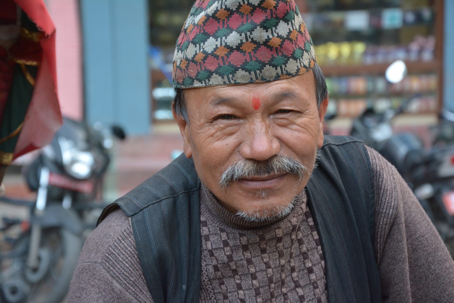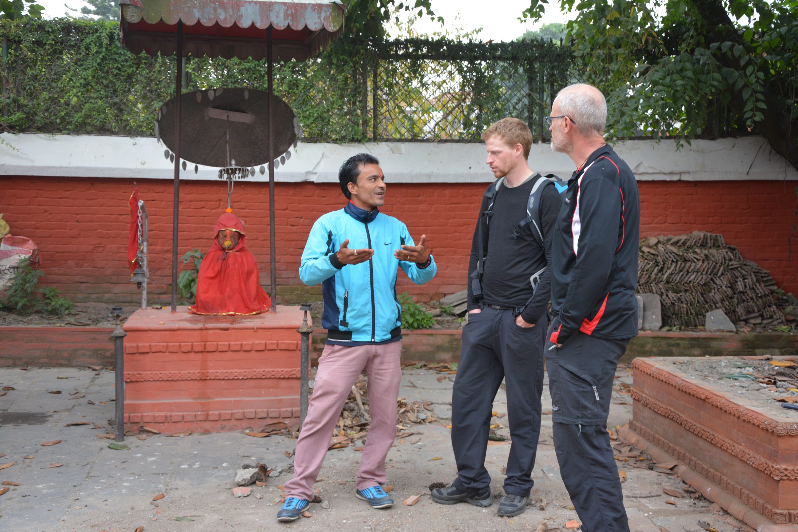 An unserem letzten Tag in Kathmandu streifen wir noch einmal durch die Stadt und betreten in einem Hinterhof, wo es eine kleine Tempelanlage gibt. Sofort kommt ein junger Mann zu uns und fragt, ob er uns etwas ober die hinduistischen Götter erzählen darf. Misstrauisch wie Touristen vermuten wir ein Falle, d.h. dass er am Schluss die Hand aufhalten wird. Was aber nicht der Fall ist! Er tut es aus Interesse an der Sache. Ob er am Ende ein Trinkgeld von uns bekommen hat, weiß ich gar nicht mehr. Ich hoffe es…