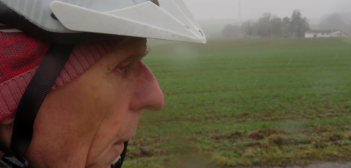 … auf der Nase, auf dem Helm, auf der Hose, auf dem Lenker, auf den Blättern, auf den Ästen, in den Pfützen…