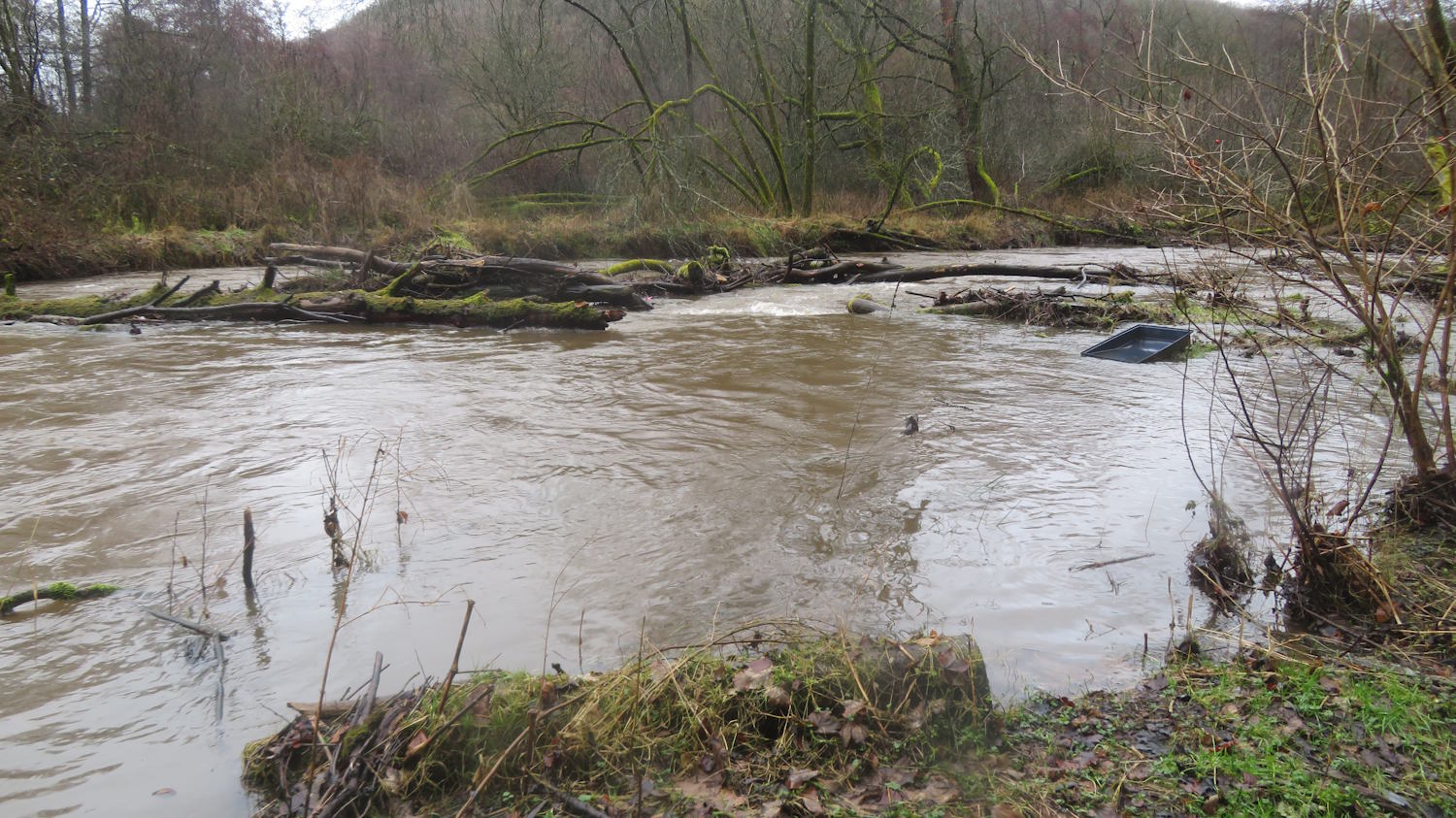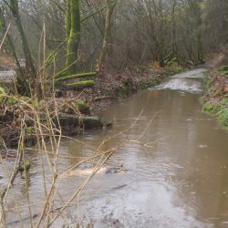 Antwort: Nein, nur schwimmen… Im vorderen Teil ist ein langes Stück Weg überflutet. Da ich nicht abschätzen kann, wie tief das Wasser hier steht, kehre ich lieber um und fahre noch zum Weiher an der Straße nach Nunkirchen…