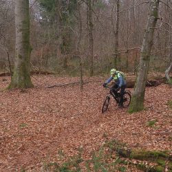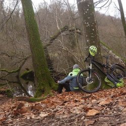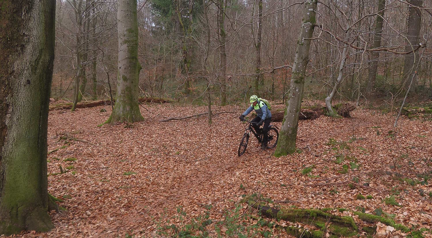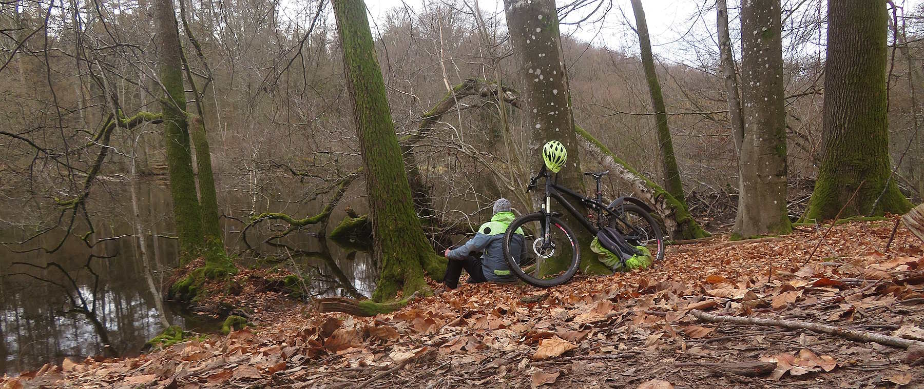 Auch auf dem Weg zum Geisweiler Ho, in der Nähe der Schranke liegt ein Baum quer, also fahre ich rechts um den Weiher herum…