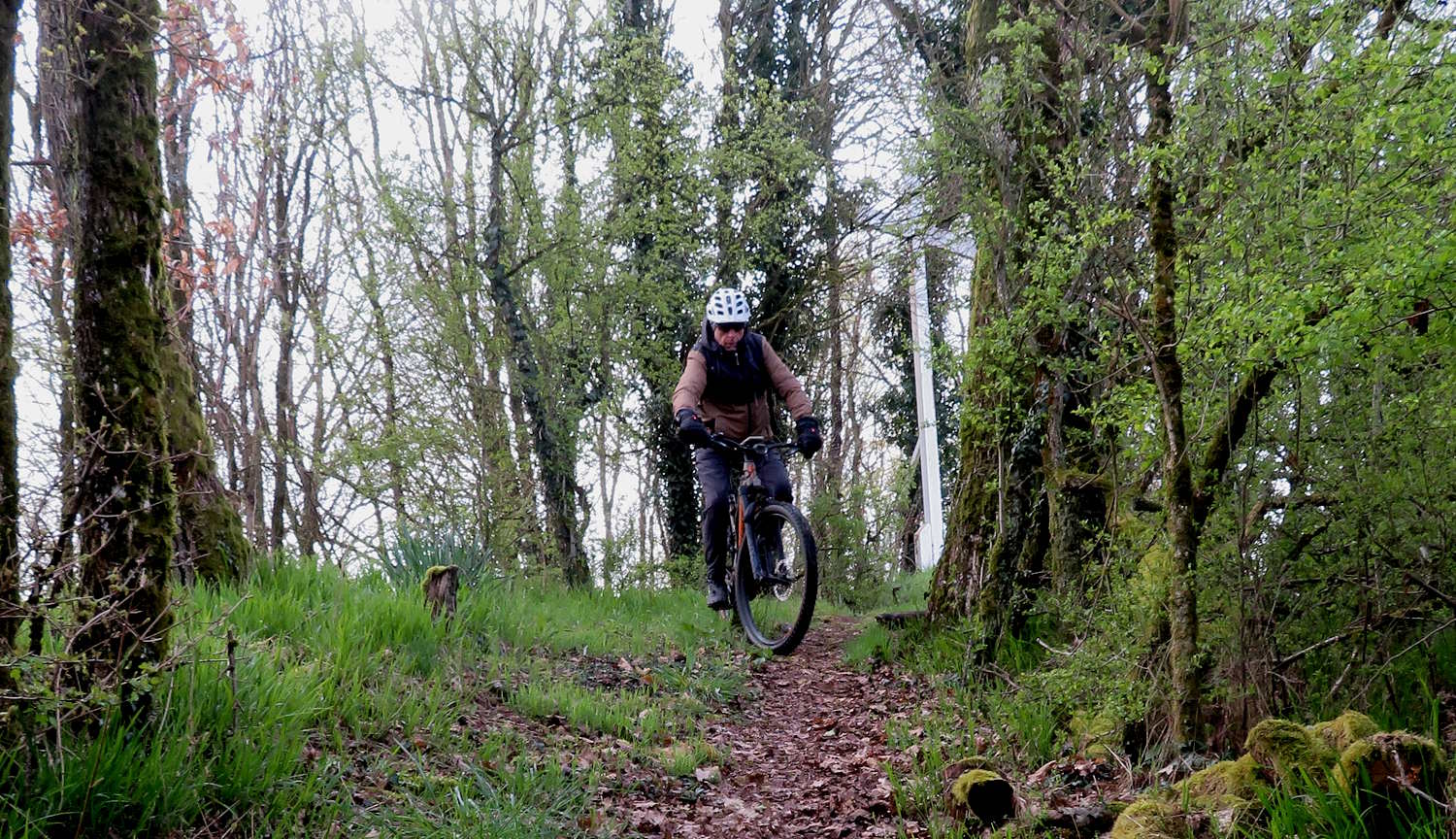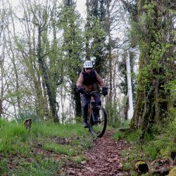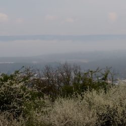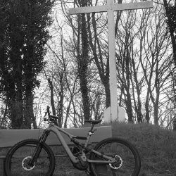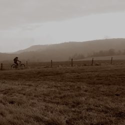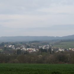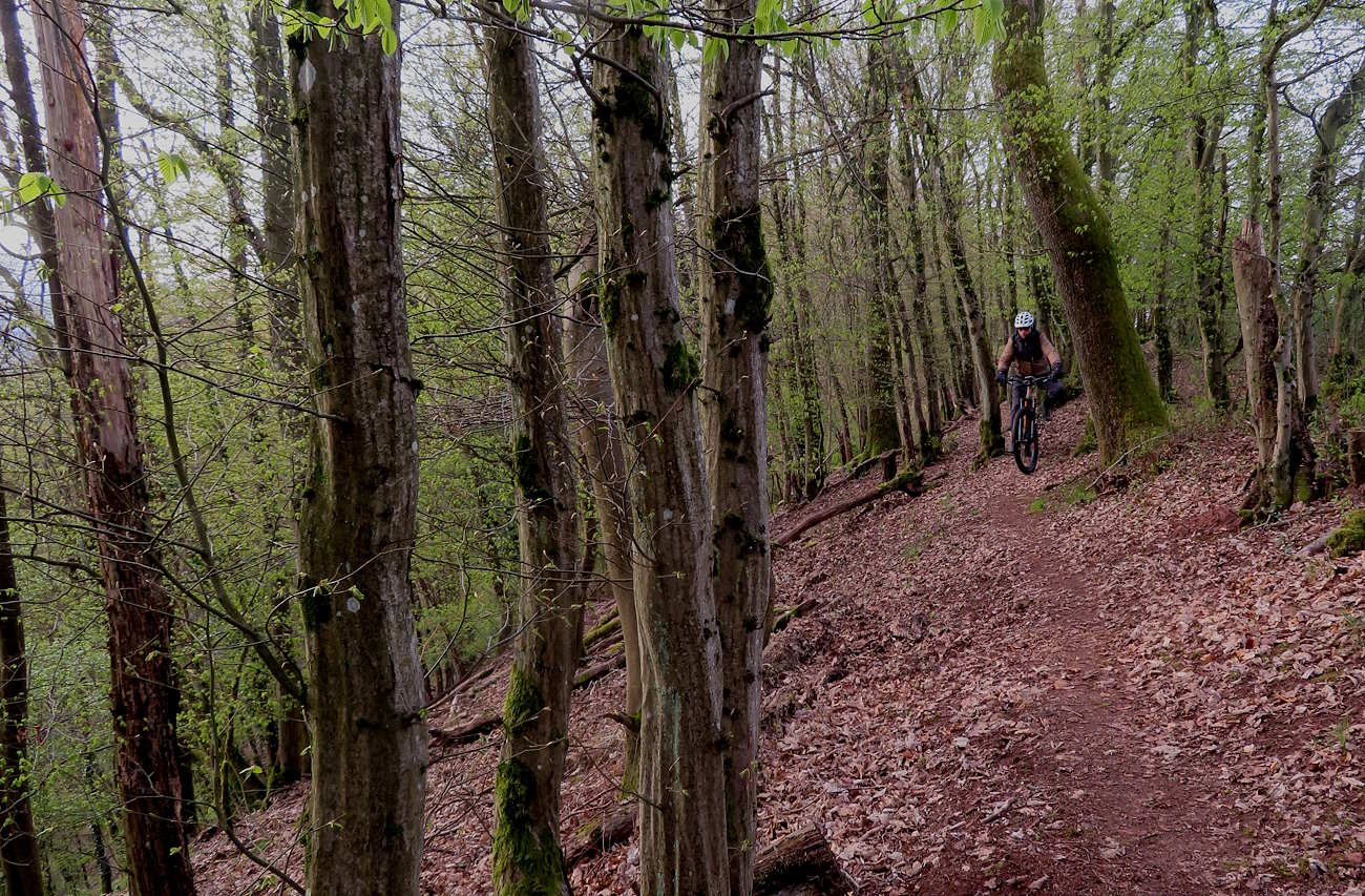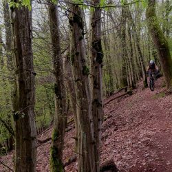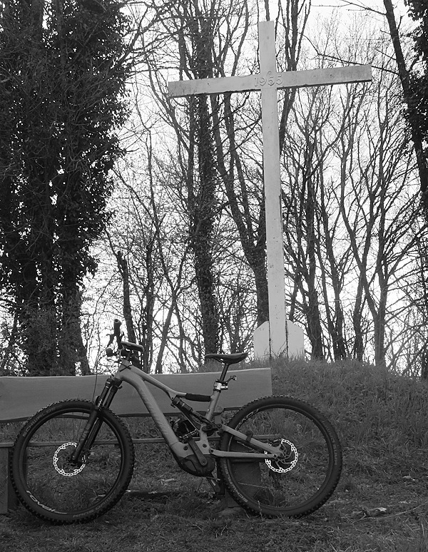Zuerst kurbele ich aber auf Auschet hoch, um einen Blick in die diesige Landschaft zu werfen. Wolken hängen noch tief über dem Land. Dann geht es durch den Wald runter und rüber zum Schatterberg. Am Feld vorbei fahre ich hoch zum weißen Kreuz und nach einer kurzen Rast über den schönen Trail am Hang hinunter zum Teersträßchen…