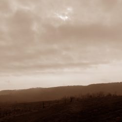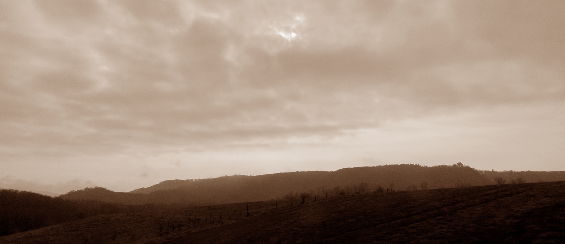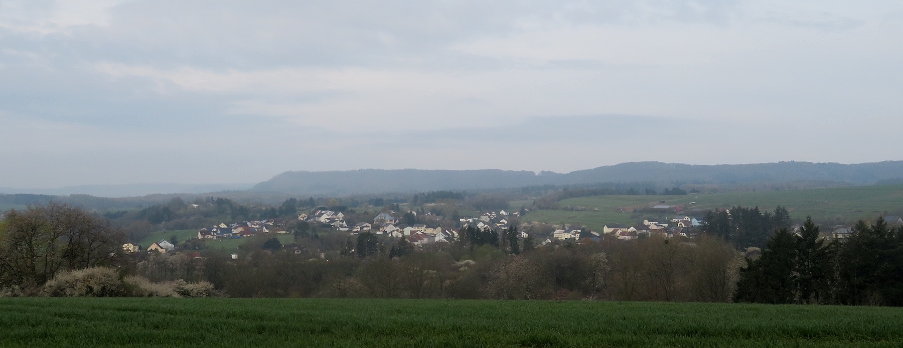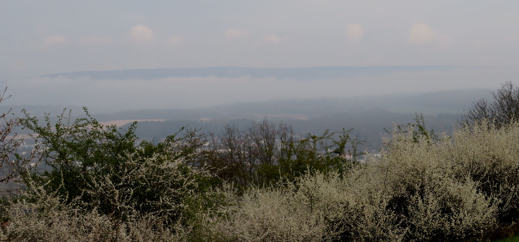 Zuerst kurbele ich aber auf Auschet hoch, um einen Blick in die diesige Landschaft zu werfen. Wolken hängen noch tief über dem Land. Dann geht es durch den Wald runter und rüber zum Schatterberg. Am Feld vorbei fahre ich hoch zum weißen Kreuz und nach einer kurzen Rast über den schönen Trail am Hang hinunter zum Teersträßchen…