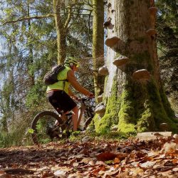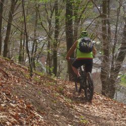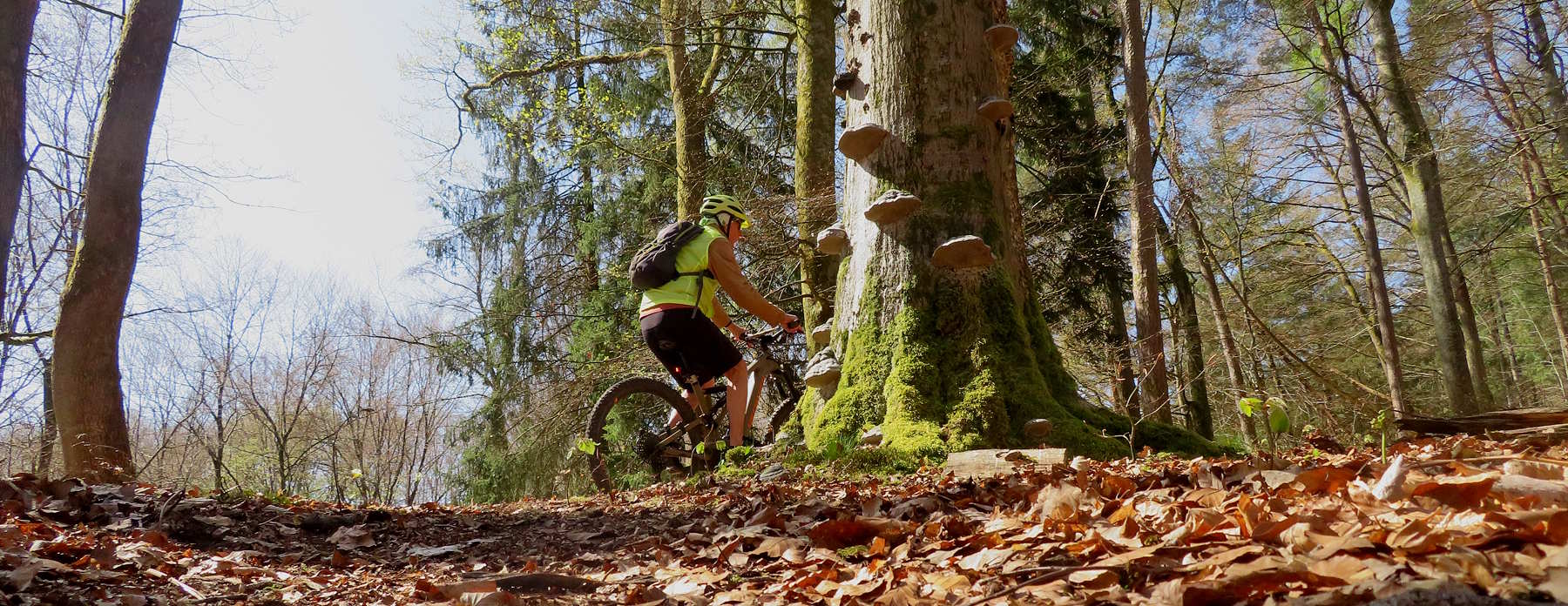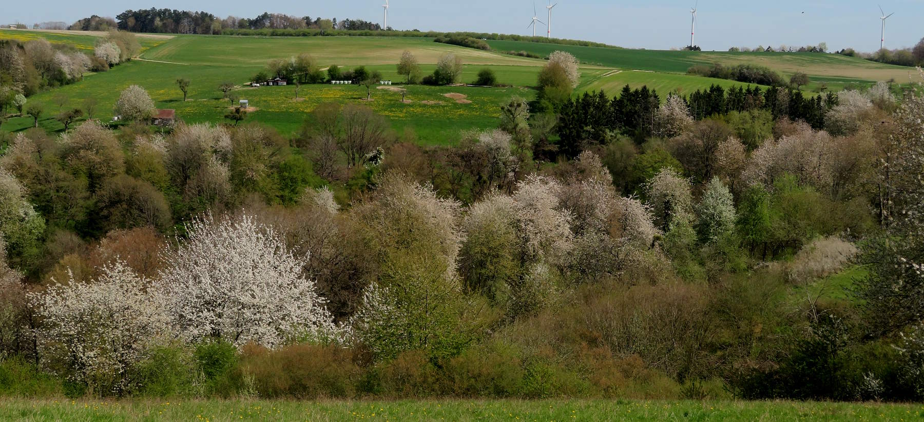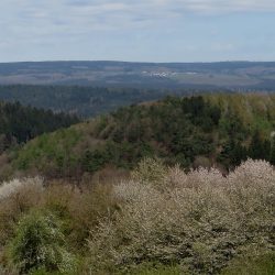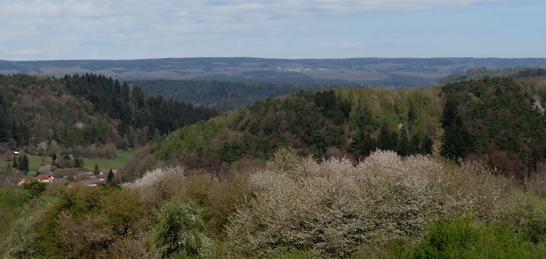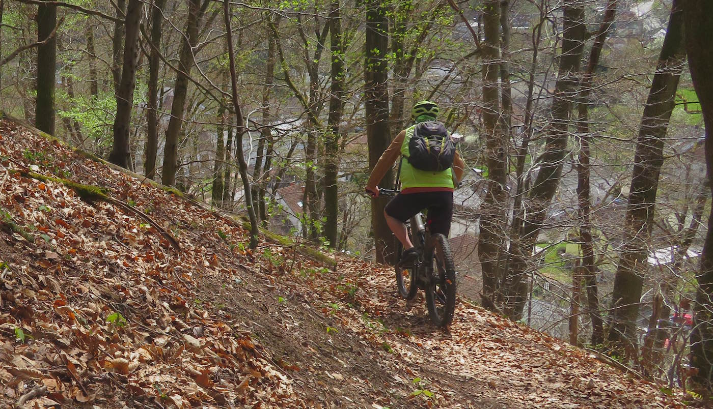 Um möglichst viel in der Sonne zu sein, geht es zuerst hoch auf die Wahlener Platte und dann rüber nach Hargarten. Oberhalb des Ortes verläuft der Hausstadter Panoramaweg, dem ich bis Honzrath folge. Dort probiere ich einen fast vergessenen Trail runter in den Ort aus: Leider nicht mehr gut fahrbar, weil im unteren Teil ziemlich zugewachsen…