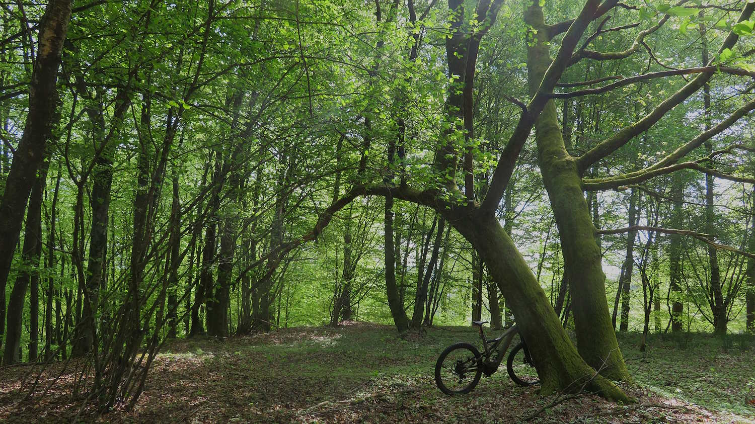 Man folgt der Straße links neben der Kita in Wahlen den Berg hoch: eine Teerstraße, die später in einen Schotterweg übergeht und am Waldrand beginnt dann der Trail. Oft ist er gar nicht zu erkennen, weil zugewachsen. Auch heute muss ich einiges Holz aus dem Weg räumen. Zwei umgefallene Bäume jedoch müssen wohl liegen bleiben und zwingen zum Absteigen.