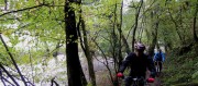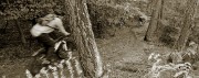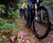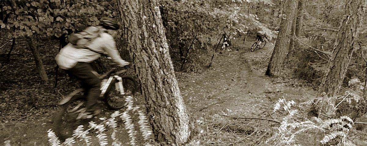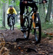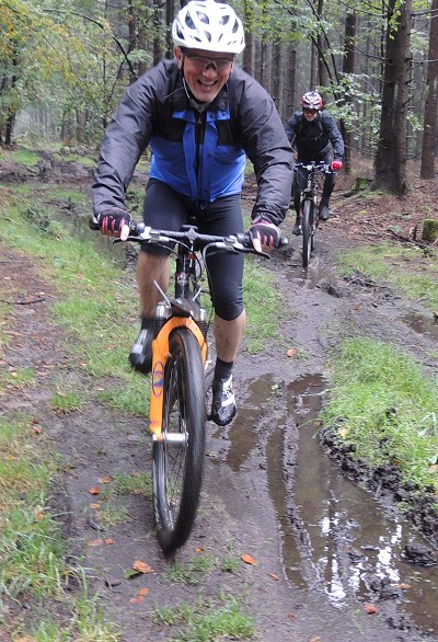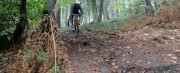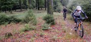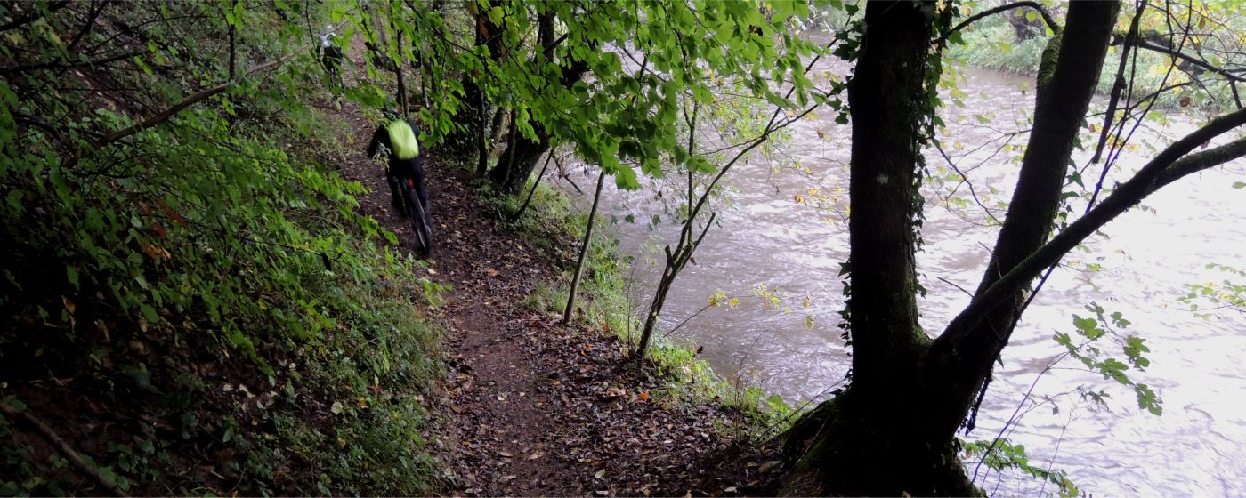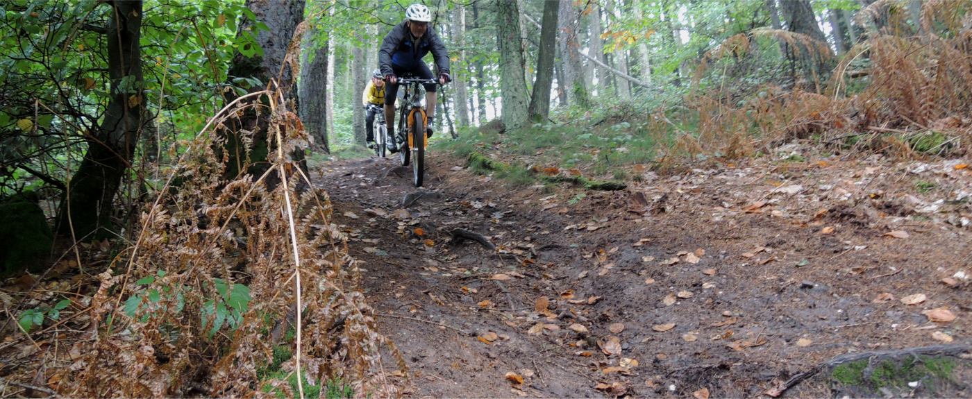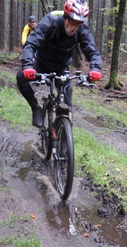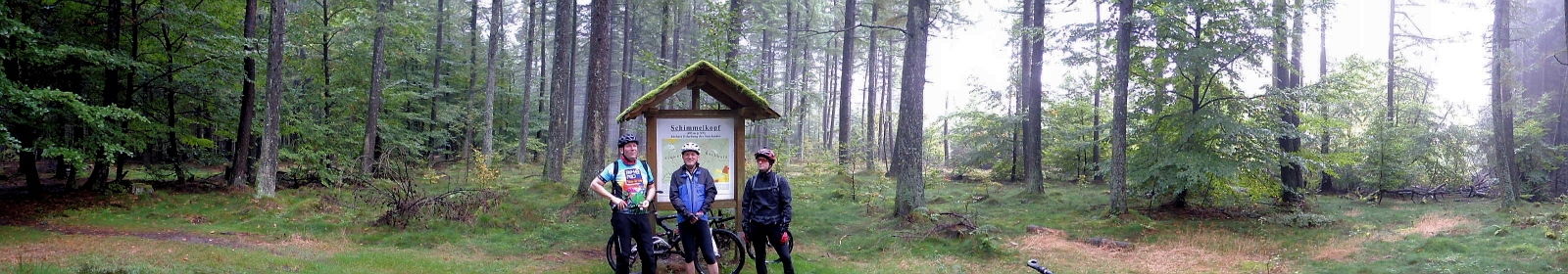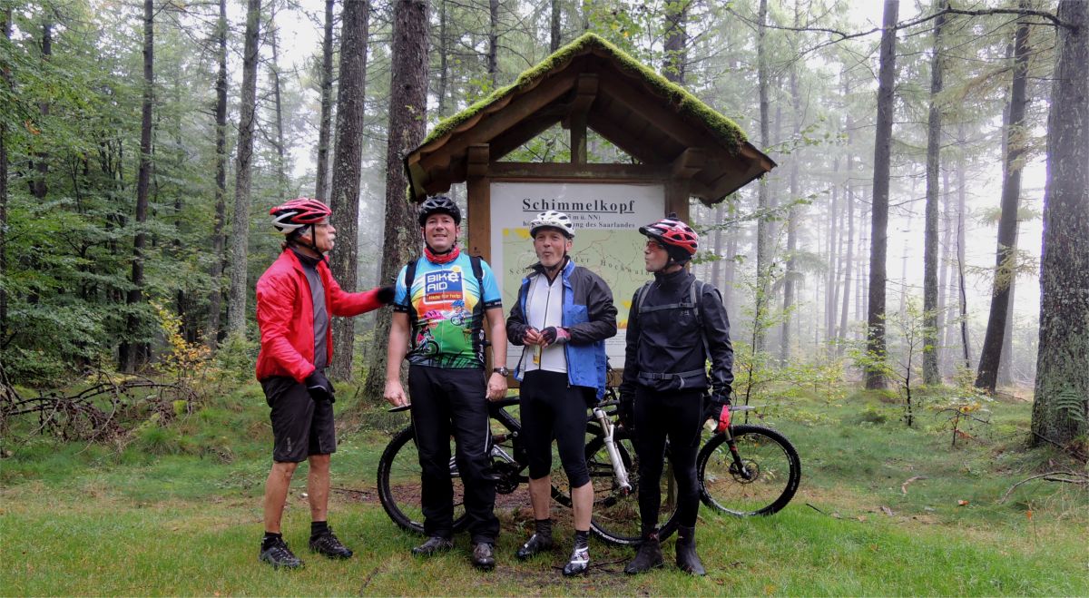 Wo gibt es die höchstgelegenen feuchten Trails im Saarland? Klar, am Feuchtkopf, wie man ihn nennen müsste, obwohl der Name „Schimmelkopf“ schon auf den dauerfeuchten Zustand deutlich hinweist. Fast zu jeder Jahreszeit ist der Boden hier schlammig, schwarz und voller Pfützen. Auch die Abfahrt hinunter zum Hölzbach sieht entsprechend aus. An diesem Sonntag hat´s zudem noch geregnet und wir waren alle froh, den schönen, aber in diesem Zustand gefährlichen Trail geschafft zu haben. Uwe hat sogar fast gejubelt. Zu Recht.