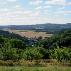 Teile unseres Weges oberhalb des Hausstadter Tals sind von vertrockneten Kirschkernen übersät und sie bleiben in unseren dicken Stollen stecken. Öfter halten wir an, um sie heraus zu klauben, weil sie auf Asphalte zu viele Geräusche machen…