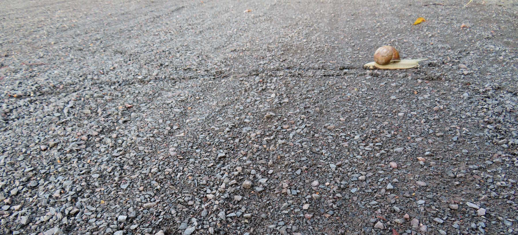 Außer mir sind noch einige Schnecken auf dem Radweg bei Krettnich unterwegs. Die meisten hinterlassen feuchte Kriechspuren auf dem feinen Schotter. Ich hoffe, sie sind in Sicherheit, bis hier der sonntägliche Radverkehr beginnt…