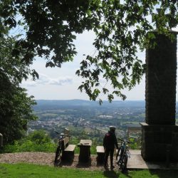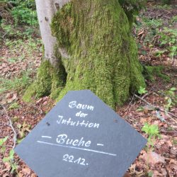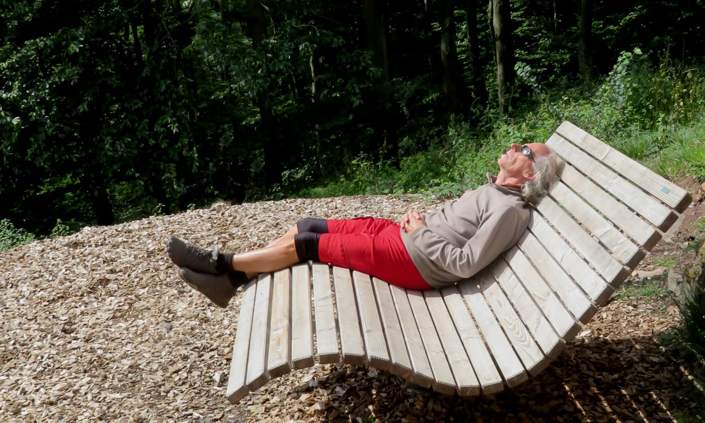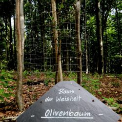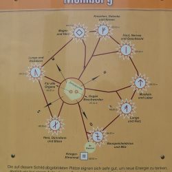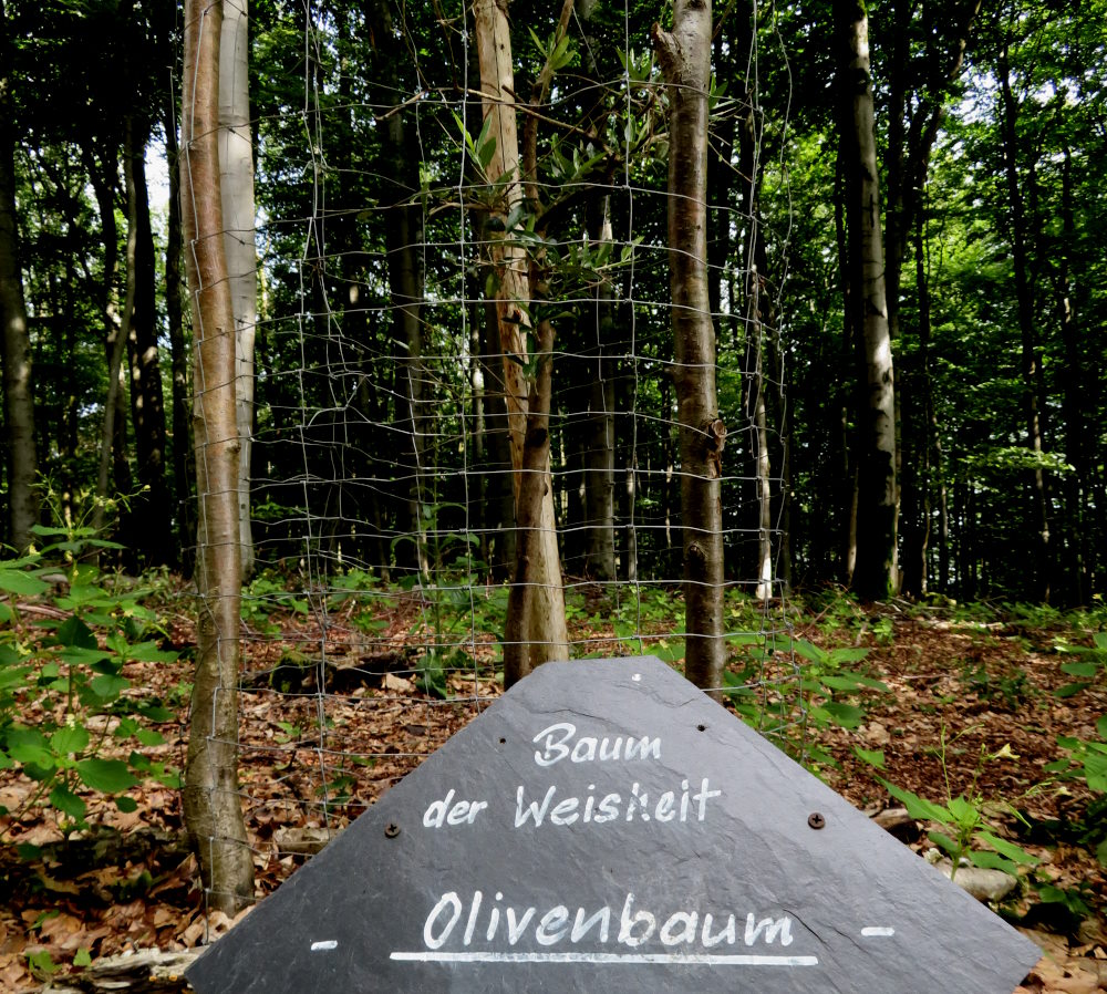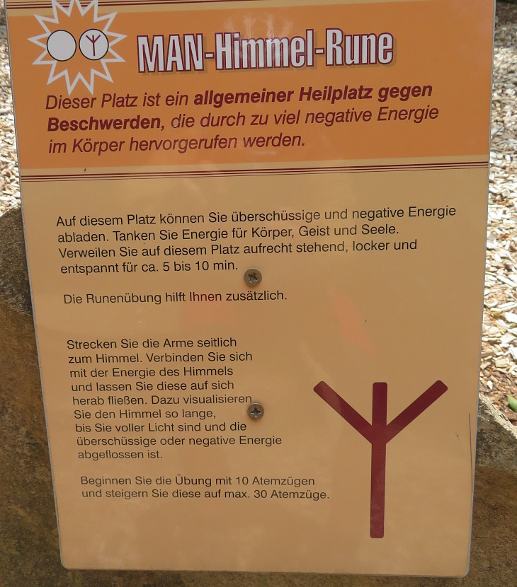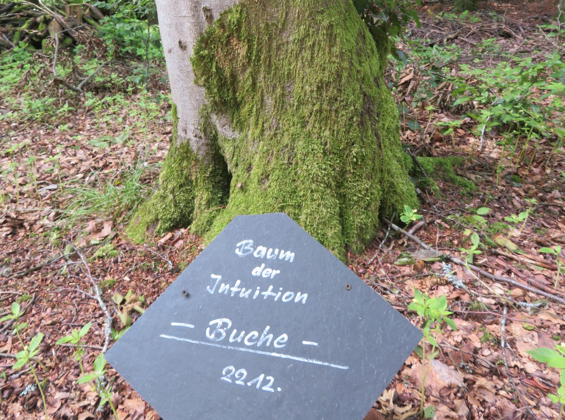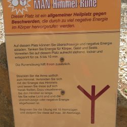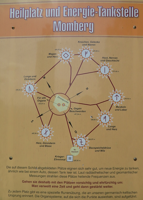 Der Momberg ist ein Heil- und Kraftort. Schon die Kelten hatten dies erkannt und hier einen Ringwall errichtet. Und seither wird dieser Ort als „Tankstelle“ genutzt. Man kann einen Parcours absolvieren und seine diversen Chakren und Organe energetisch aufladen. Auch die keltischen Runen sind interessanterweise in die Anwendungen mit einbezogen. Auch ein Baumkreis entsteht mit Kraftbäumen. Infotafeln zeigen, welche Kräfte einzelnen Baumsorten zugesprochen werden. Wir verweilen hier einige Zeit und schöpfen dann am Kreuz und Aussichtspunkt zusätzlich etwas Kraft, indem wir unsere Brote vertilgen.
