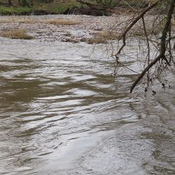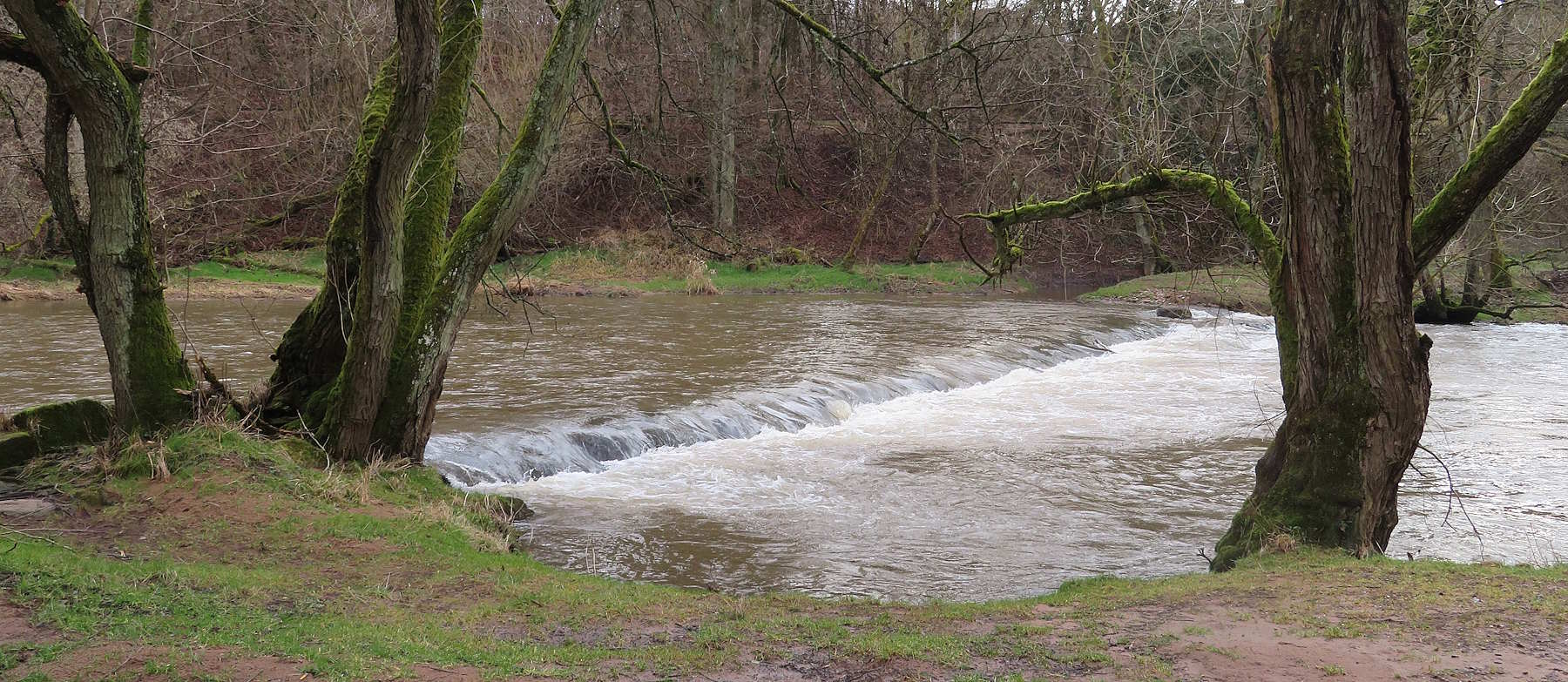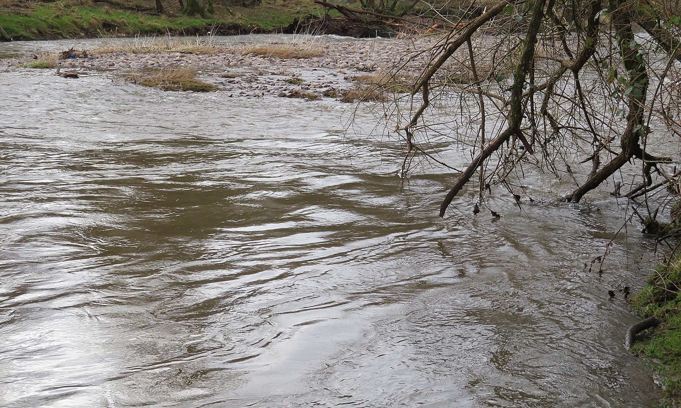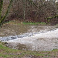 Die Prims ist voll und hat Schwung. Und so stürzt sie ziemlich lautstark über die Steine des Wehrs vor Primsweiler…