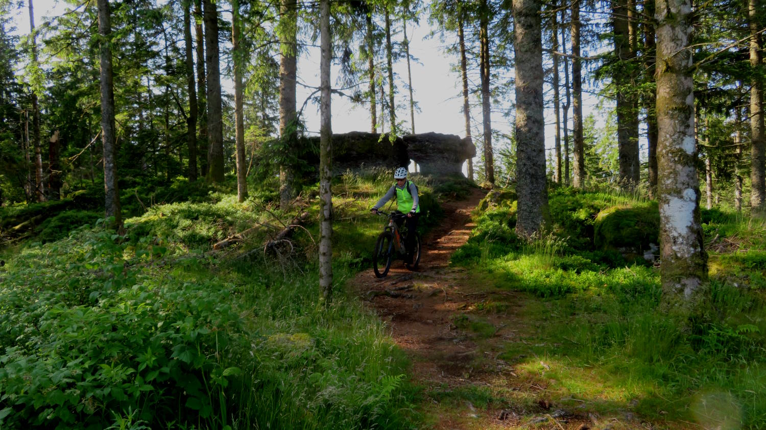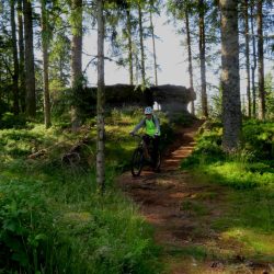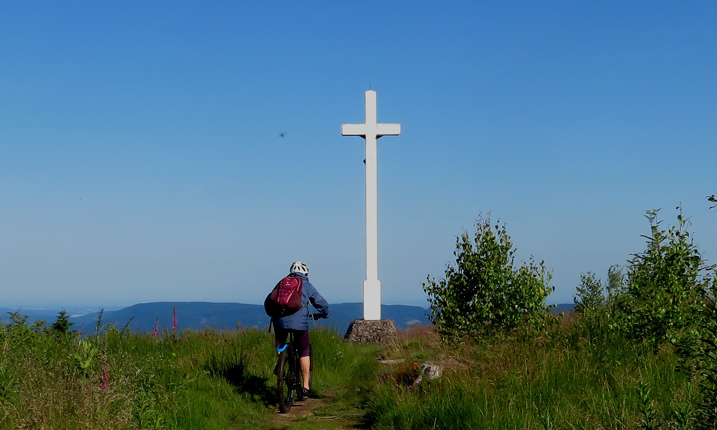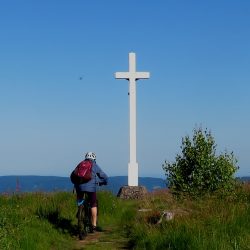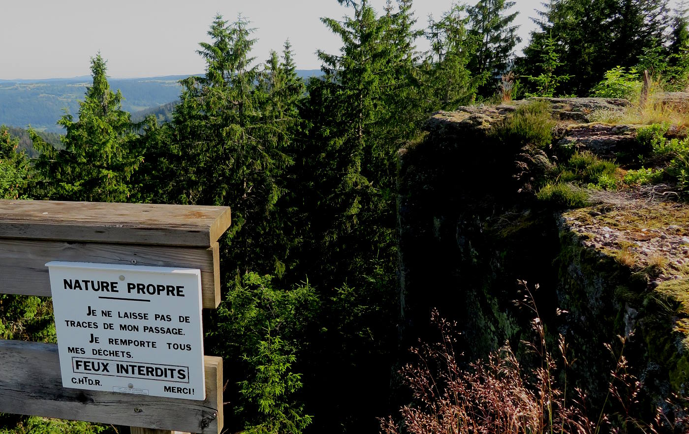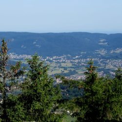 Zuerst geht es aber – bei wieder schönem Wetter – hoch zum Haut du Roc 1012m), den wir am Sonntag zu Fuß wegen eines Gewitters nicht erreicht haben. Mit dem Ebike auch nicht ganz einfach, weil die Wege zum Teil mit dickem, rutschigem Schotter gefüllt sind. Oben hat man eine tolle Weitsicht…
