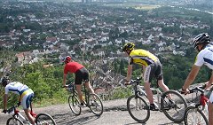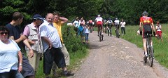 Die Ergebnisse 35 km - Teams (Plätze): 1 Groß Peter / Sascha Mai 2 Rad-Fun-Team Bekond 3 Martini-Kohlhaas Connection 2 Mixed: Andrea / Peter Bach "alle" Plätze Frauen: Elisabeth / Marita Einzelfahrer: 2 Norbert Ergebnisse 65 km - Teams: 1 Bike Aid mit Zorro / Seel Tag: So, 12.8.07 Fahrer/innen: Benjamin, Jonas Wetter: 32 Grad, Sonne 1. Zeller Schwarze Katz Marathon ... dann waren es doch 200 Starter beim Jungfernlauf des Schwarze-Katz-Marathons in Zell. Die Sonne scheint, die Pflastersteine des Örtchens glänzen und als uns Udo K. begegnet und sich als Sprecher der Veranstaltung outet, sind das genug gute Vorzeichen für eine erfolgreiche Veranstaltung - für beide Seiten, den Zeller MTB-Club und uns. Elisabeth fährt eine Runde, die etwa 30 km lang ist, die anderen nehmen sich zwei vor. Wer einen Marathon fahren will, muss dreimal durch Zell. Die Strecke ist flüssig zu fahren: angenehme Steigungen, die einen auch beim zweiten Mal nicht fix und fertig machen, schöne Ausblicke auf die Mosel mit ihren Weinbergen. Leider ist der Singletrailanteil gleich Null, vielleicht ist beim nächsten Mal mehr "herauszuschlagen". Wenn die Unternehmen und Tourismusbranche sehen, dass Leute kommen und auch ein paar Euros hängen bleiben, geht vielleicht mehr. Aber auch Hinterzarten bietet in Bezug auf Trails nicht mehr - und Tausende kommen. Wer die Trails im Wettkampf sucht, muss zur Parallelveranstaltung nach Neustadt fahren. Interessant ist auch die Möglichkeit, in einer Staffel zu fahren. Ein schnelles Rennen, nach 2 Stunden 20 waren die Ersten des Halbmarathon im Ziel. Für uns sehr erfreulich: Benjamin und Michael Bonnekessel, der frisch gekürte Deutsche Seniorenmeister, fahren gemeinsam über die Ziellinie, Jonas folgt kurz darauf... Leider fuhr ich nicht schnell genug, um zur Siegerehrung dabei zu sein, die direkt nach dem Eintreffen der drei Ersten stattfand. Wenn ich das gewusst hätte ... Ganz nach oben aufs Treppchen darf auch Andrea steigen: Platz 1 bei den Frauen. Tino hat zu dieser guten Platzierung auch seinen Teil beigetragen... Zwei weitere gute Platzierungen fahren - auf der langen Distanz - noch zwei weitere Bike Aid Fahrer ein: Stefan Seel Platz 2 und Zorro Platz 4. Ihn ereilten zwei Plattfüße - mit nur einem Schlauch im Trikot und (zu viel Optimismus) schnell ein Problem. Die Mosel ersetzt uns zum Schluss die Dusche. Den Schlamm aus den Weinbergen, der dick an unseren Beinen hängt, lassen wir von den Wellen davontragen. An den Bikes war er tags darauf erheblich schwieriger abzubekommen... Ergebnisse (Halbmarathon): Benjamin Platz 1 - 2:22 Std Jonas Platz 2 - 2:28 Std Norbert Platz 1 Sen3 - 3:04 Std Anndrea/Tino Platz 1 Damen - 3:40 Std Elisabeth 30km - 2:21 Std Tag: So, 11.8.07 Fahrer/innen: Benjamin, Jonas Strecke: MTB Cup Saar - Hirzweiler Wetter: 26 Grad, bewölkt MTB Cup Saar Pfalz - Hirzweiler Ds Kirmesrennen … aber wo war die Kirmes? Seltsam: ein Kirmesrennen ohne Kirmes! Wer zwischen den Läufen Zeit hatte, konnte sie jedoch im Dorf suchen gehen! Aber die Veranstaltung selber hatte genug Charakter und Flair, so dass sich das Bedürfnis nach kommerziellem Rummel in Grenzen hielt. Der RV Tempo Hirzweiler stellte eine gelungene Veranstaltung auf die Beine: das traditionelle Kirmesrennen, das besonders Radler und Undedarfte vom Mountainbiken begeistern soll, und in die gesamte Veranstaltung integriert war der letzte Lauf des MTB Cup Saar. Ein Zeitfahren über 6 km, in zwei Läufen musste man/frau kräftig in die Pedale treten. Es ging um Sekunden… Es blieb viel Zeit für Gespräche und natürlich zum Biertrinken. Eine Schmelzer Bikegruppe ist (deshalb) gern gesehener Gast bei dieser Veranstaltung… Bis die Ergebnisse der Rennen ausgezählt waren, verging schon einige Zeit. Dankenswerterweise wurde die Siegerehrung der Cup-Fahrer vorgezogen. Viele von ihnen hatten noch am folgenden Sonntag eine nächste Veranstaltung… Die Ergebnisse (Herren): Benjamin Platz 1 / Peter G. Platz 2 / Jonas Platz 3 Cup Gesamtwertung Benjamin Platz 1 Herren Jonas Platz 2 Herren Nadine Platz 3 Frauen Andrea Platz 4 Frauen